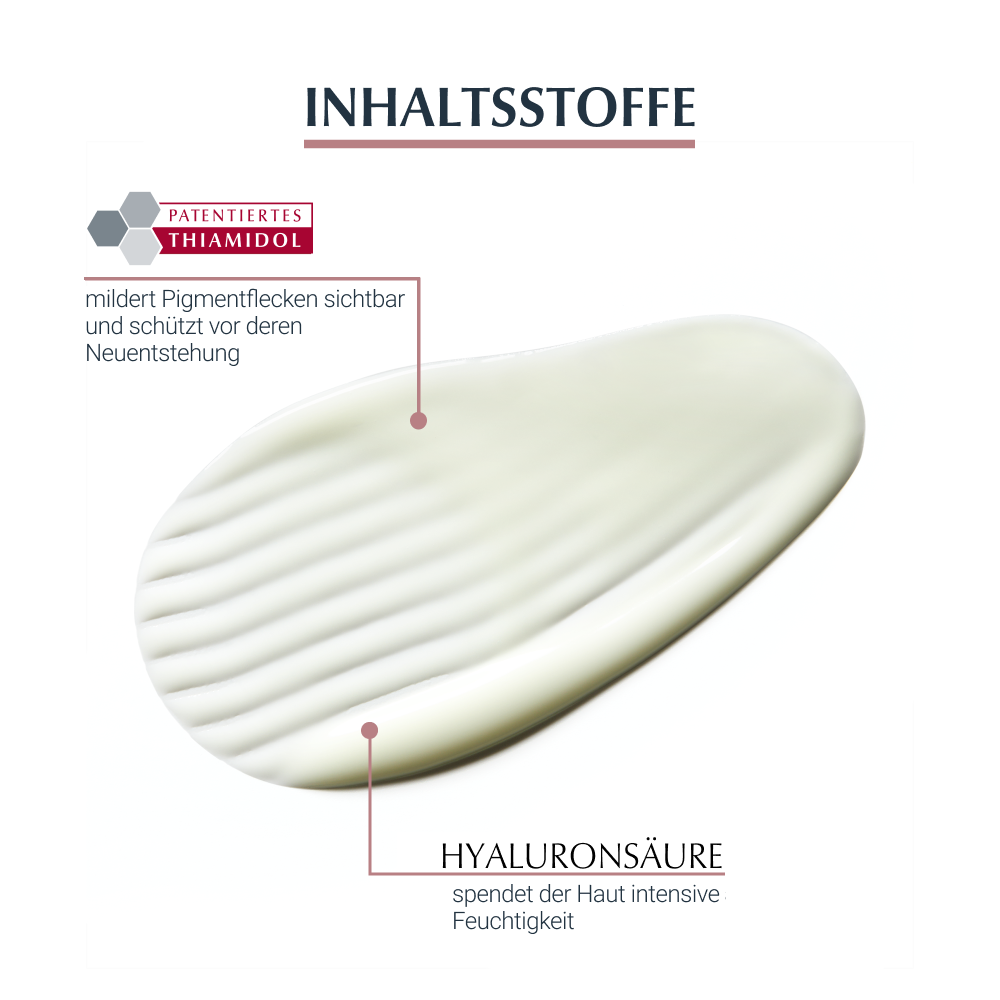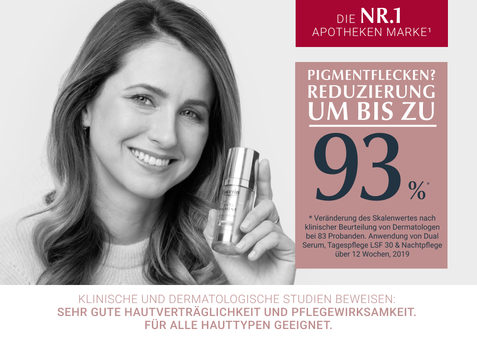 Das Eucerin Anti-Pigment Dual Serum mit dem Einkammer-Spender wirkt mit patentiertem Thiamidol®, das Pigmentflecken und sogenannte Altersflecken am Ursprung bekämpft, diese nach und nach mildert sowie bei regelmäßiger Anwendung verhindert, dass neue Pigmentflecken entstehen. Zusätzlich enthält die Gesichtspflege Hyaluronsäure, die der Haut intensive Feuchtigkeit spendet. Beide Texturen sind leicht und ziehen schnell ein – für ein strahlenderes Aussehen und einen ebenmäßigeren Hautton.