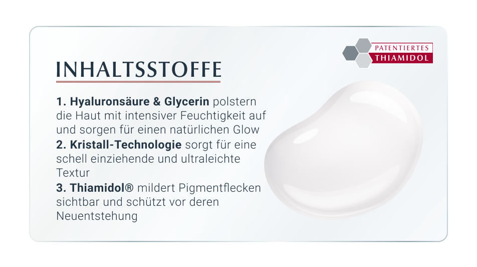 - Empfehlung: Für ein ideales Pflegeergebnis bis zu viermal pro Tag Produkte mit Thiamidol® verwenden.