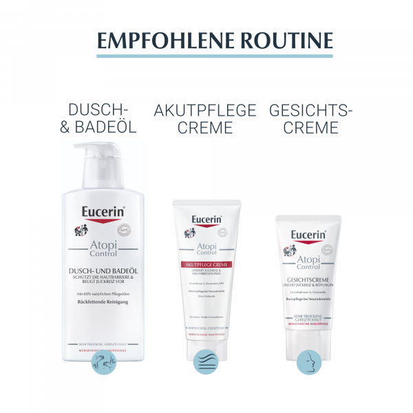 - Ergänzend kann das rückfettende AtopiControl Dusch- und Badeöl verwendet werden und in akuten Phasen die AtopiControl Akutpflege Creme