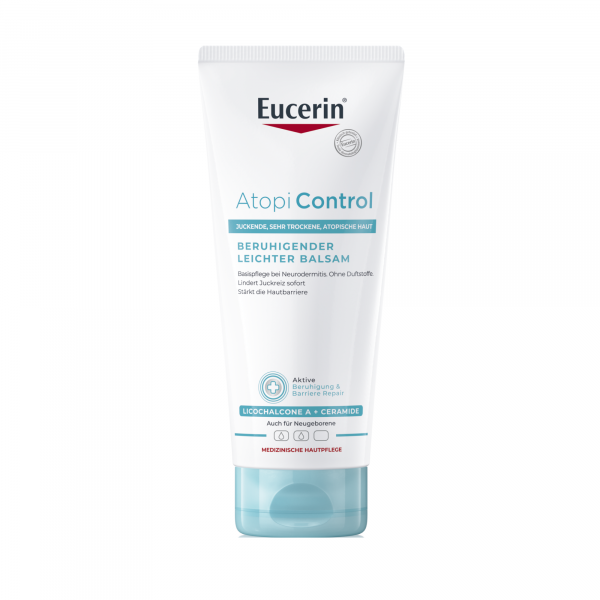 Der Eucerin AtopiControl Balsam ist eine gut einziehende Hautpflege bei Neurodermitis, gereizter und sehr trockener Haut. Die Formel mit Pflegewirkstoffen auf pflanzlicher Basis enthält hautberuhigendes Licochalcone A (Extrakt aus der Süßholzwurzel), natürliche Lipide wie Omega-Fettsäuren (Nachtkerzensamenöl, Traubenkernöl) und pflegende Sheabutter. Die Wirkstoffe der Body Lotion versorgen die Haut mit Feuchtigkeit, machen sie geschmeidiger und pflegen trockene Haut. Zudem wird Juckreiz gelindert und hierdurch die Schlafqualität verbessert. Fehlende Lipide werden mit der Creme in der Hautbarriere ersetzt und sie hinterlässt ein intensives Pflegegefühl. Bei regelmäßiger Anwendung bessert sich der Hautzustand spürbar. Die Creme lässt sich leicht verteilen und zieht schnell ein.