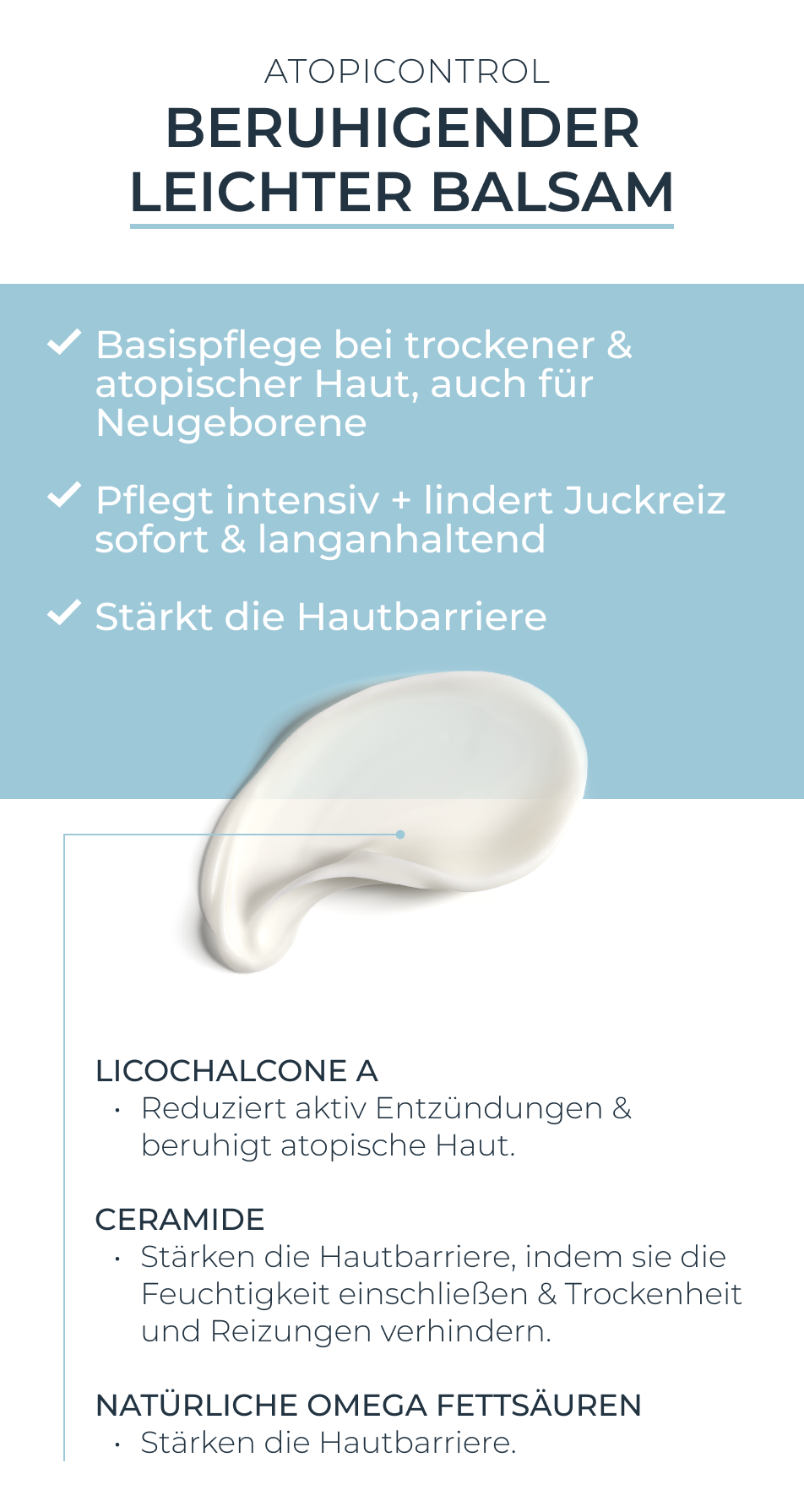 - Ergänzend kann das rückfettende AtopiControl Dusch- und Badeöl verwendet werden und in akuten Phasen die AtopiControl Akutpflege Creme
