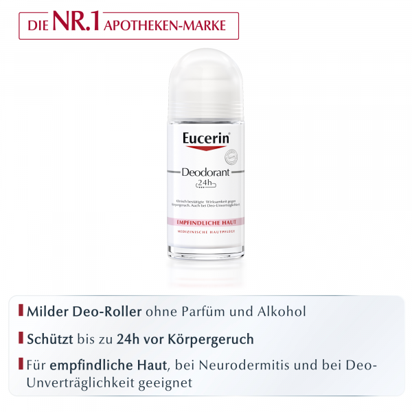Das Eucerin Deodorant Empfindliche Haut 24h Roll-on bietet zuverlässigen Deo Schutz für empfindliche Haut. Mit dem Deodorant wird nachweislich die Aktivität der geruchsbildenen Bakterien reduziert und es wirkt so für 24 Stunden gegen Körpergeruch im Achselbereich. Dabei ist der Deo Roller sanft zu empfindlicher Haut und auch bei Deo-Unverträglichkeit geeignet.