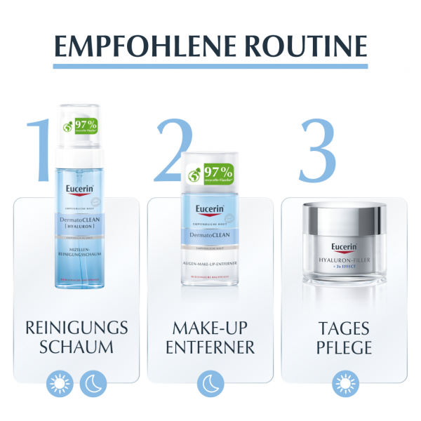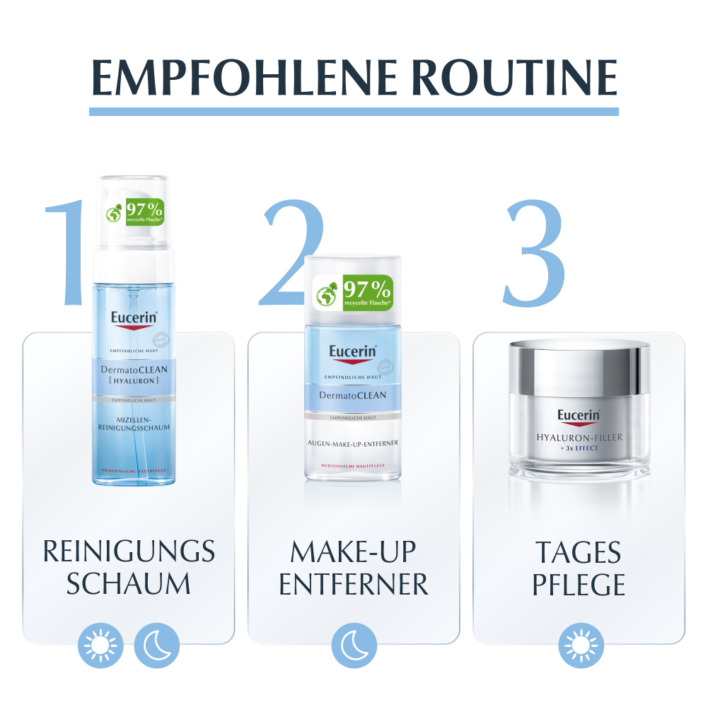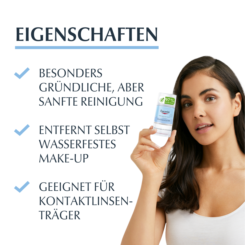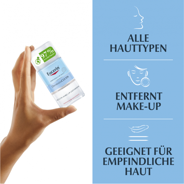 Der Eucerin DermatoCLEAN Augen-Make-Up-Entferner wurde ophthalmologisch getestet und ist für alle Hauttypen, auch für empfindliche Haut sowie für Kontaktlinsenträger geeignet.