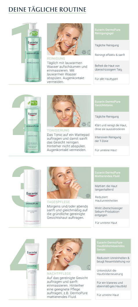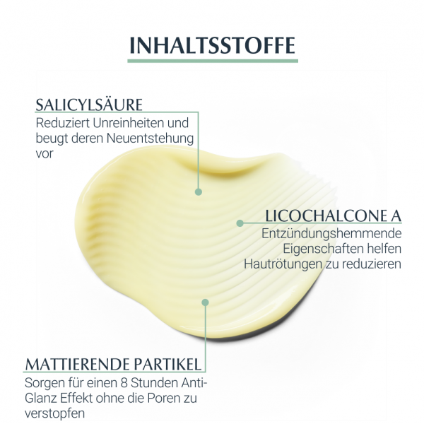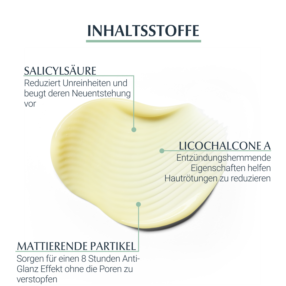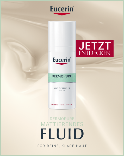 Das Eucerin DermoPure Mattierende Fluid hilft effektiv bei anspruchsvoller, unreiner, zu Akne neigender Haut und Pickeln. Außerdem können die Unreinheiten langfristig kontrolliert werden. Die Gesichtspflege kombiniert mehrere Inhaltsstoffe für ein reineres und mattiertes Hautbild: Salicylsäre reduziert Hautunreinheiten und beugt ihrer Neuentstehung vor, Licochalcone A beruhigt bei Hautirritationen und reduziert Gesichtsrötungen, die sebumregulierende Technologie hilft die überschüssige Talg-Produktion zu hemmen und mattierende Partikel sorgen für einen 8-stündigen Anti-Glanz Effekt, ohne die Poren zu verstopfen.