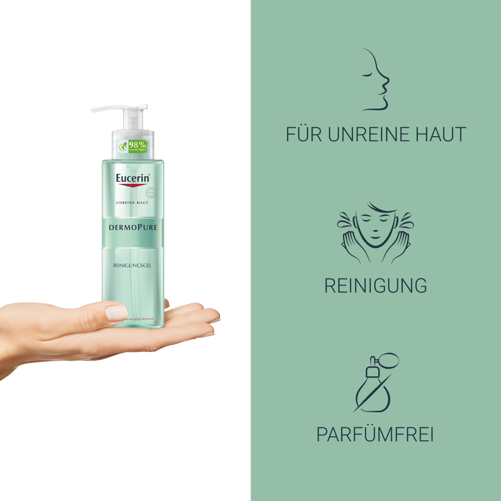 Das Eucerin DermoPure Reinigungsgel befreit die Haut effektiv und dabei sanft von überschüssigem Talg. Das Gesicht wird durch die seifenfreie Formel mit 6 % Ampho-Tensiden intensiv gereinigt und von Schmutz befreit. Verstopfte Poren werden geöffnet und die antibakteriellen Eigenschaften hemmen das Bakterienwachstum – für ein reines Hautgefühl.