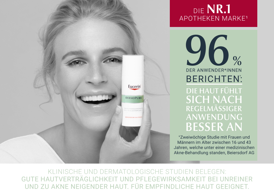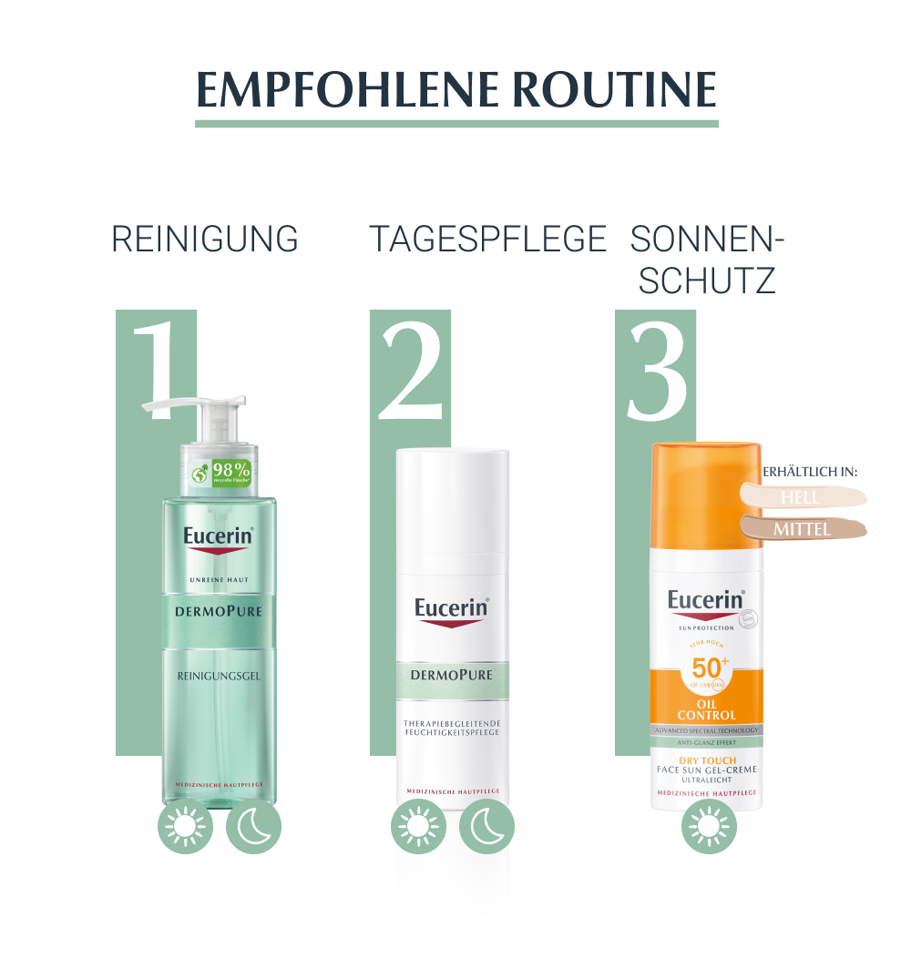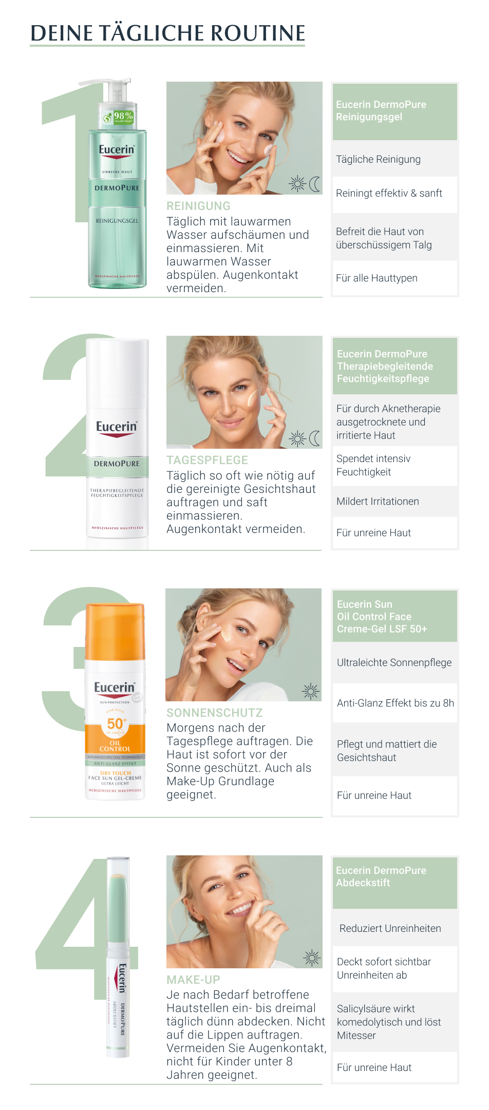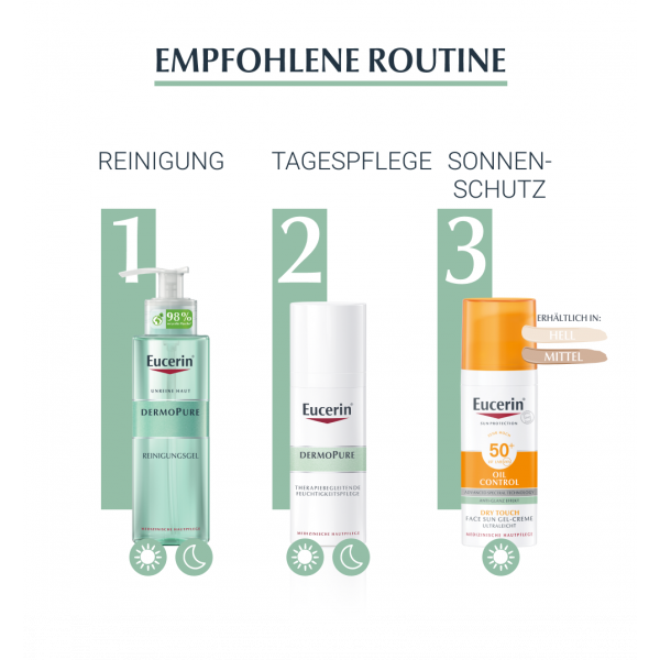 - Für die vorherige Gesichtsreinigung das Eucerin DermoPure Reinigungsgel verwenden
