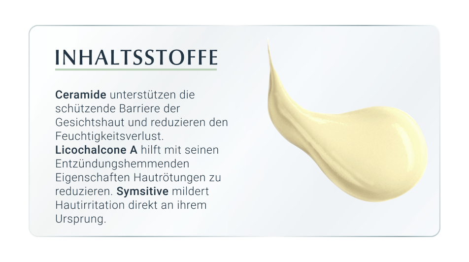 Aqua, Glycerin, Panthenol oder Dexpanthenol, Isopropyl Palmitate, Squalane, Tapioca Starch, Glyceryl Stearate Citrate, Behenyl Alcohol, Cetyl Alcohol, Hydrogenated Coco-Glycerides, Glycyrrhiza Inflata Root Extract, Ceramide NP, 4-t-Butylcyclohexanol Trans-Isomer, Dimethicone, Pentylene Glycol, Carbomer, Trisodium EDTA, Sodium Hydroxide, Phenoxyethanol