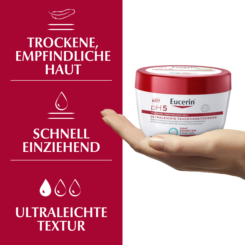 Die Eucerin pH5 Ultraleichte Feuchtigkeitscreme ist eine innovative Körperpflege für trockene Haut mit Dexpanthenol. Mit ihrer besonderen Textur gibt die Gelcreme empfindlicher Haut einen Frischekick und sorgt für ein samtig-weiches Hautgefühl. Die feuchtigkeitsspendende Creme für trockene Haut zieht schnell ein und fettet oder klebt nicht.