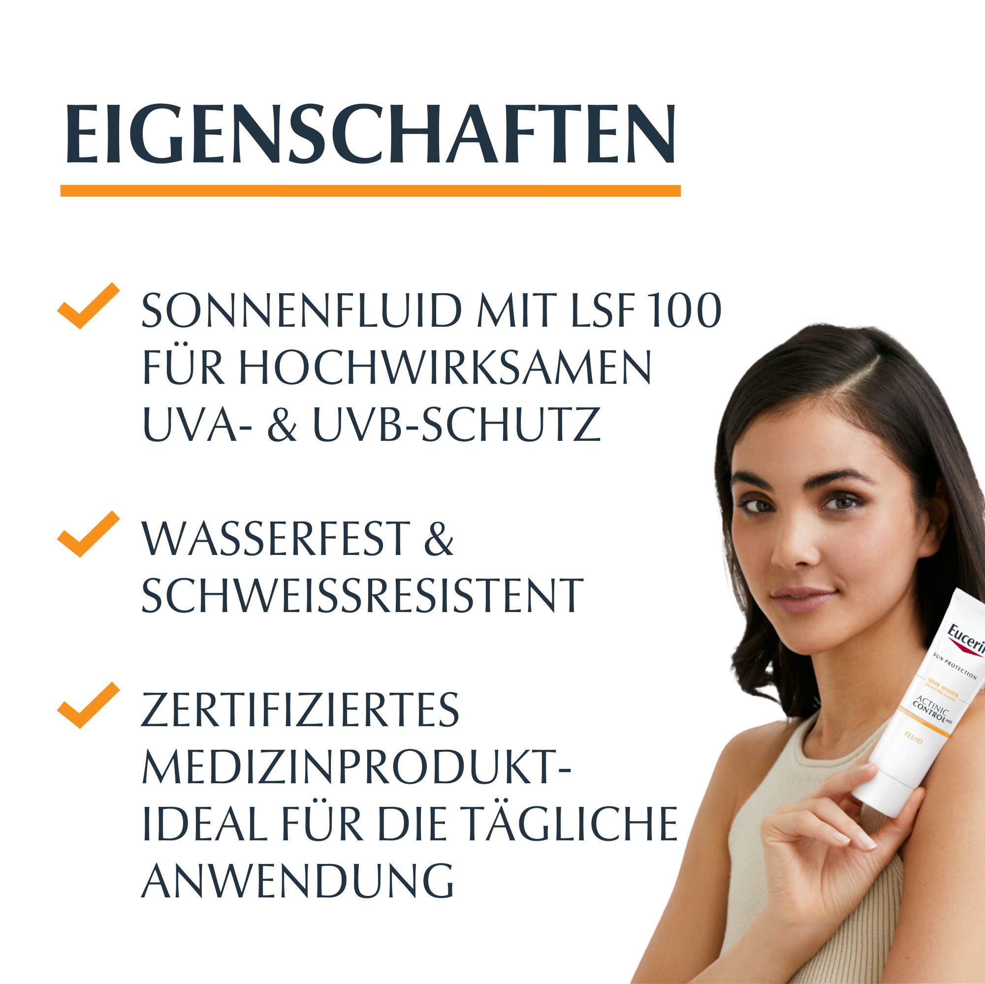 - Vor dem Auftragen von Kosmetikprodukten (Make-up, Foundation, dekorative Kosmetik) verwenden Sie bitte zuerst Eucerin® ACTINIC CONTROL MD und warten Sie, bis das Produkt vollständig eingezogen ist, bevor Sie weitere Produkte auftragen.