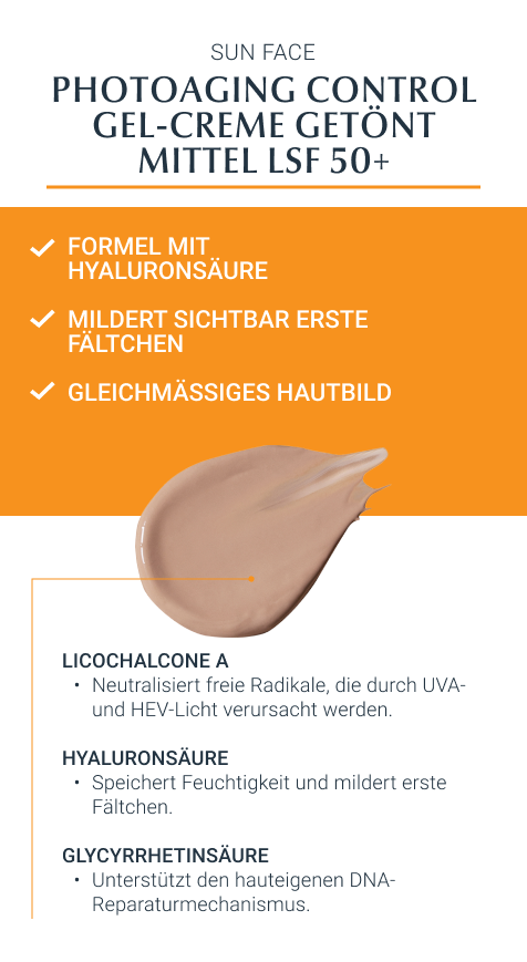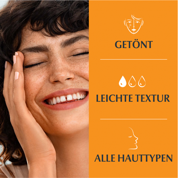 Eucerin Photoaging Control Tinted Face Sun Gel-Creme LSF50+ Mittel ist unparfümiert mit einer ultraleichten, lange deckenden und schnell einziehenden Textur für alle Hauttypen. Sie ist klinisch und dermatologisch getestet und auch empfindliche Haut verträgt sie sehr gut. 4 Tage nach einer Laser- oder Peelingbehandlung kann die Eucerin Sonnencreme angewendet werden.