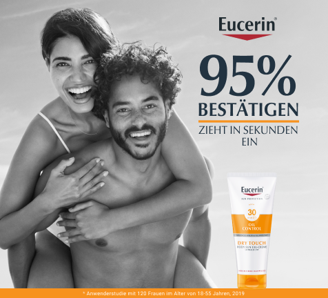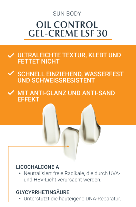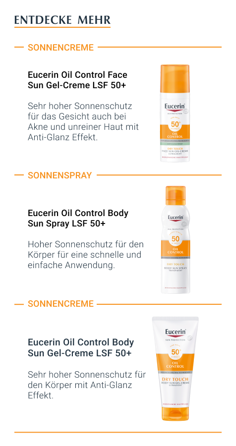 Die Eucerin Oil Control Body Sun Dry Touch Gel-Creme mit Lichtschutzfaktor 30 schützt den ganzen Körper zuverlässig vor sonnenbedingten Hautschäden. Mit der ultra leichten Textur zieht die Sonnencreme in wenigen Sekunden ein, hinterlässt keine Rückstände und fettet nicht. Die innovative Oil Control Technology der Sonnenschutzcreme mit mattierenden Pigmenten sorgt für einen sofortigen und langanhaltenden Anti-Glanz Effekt. Die unkomplizierte und schnelle Anwendung hilft die Haut optimal zu schützen. Zusätzlich ist der Sonnenschutz wasserfest sowie schweißresistent und eignet sich mit Anti-Sand Effekt ideal für den Strand und beim Sport.