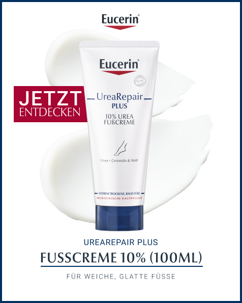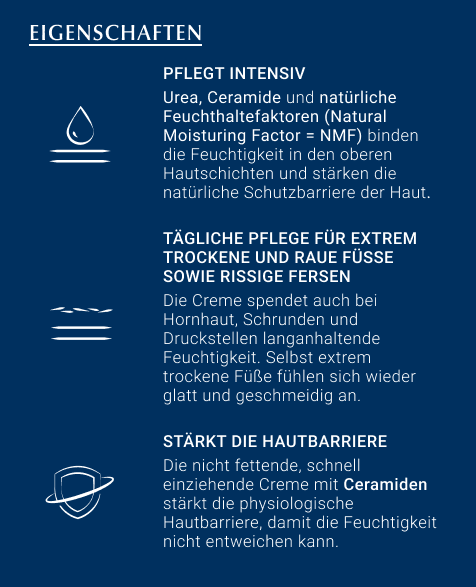 Bei den Zeichen trockener Haut an den Füßen verbessert der einzigartige Repair-PLUS-Komplex der Fußpflege die Feuchtigkeitsbindung der Haut und bringt den Lipid-(Fett-) und Feuchtigkeitshaushalt wieder in ein natürliches Gleichgewicht. Dies wird durch die Kombination der Wirkstoffe Urea, Ceramide sowie natürlichen Feuchthaltefaktoren erreicht. Ebenso versorgt die Hautcreme raue Haut an den Füßen und rissige Fersen intensiv.
