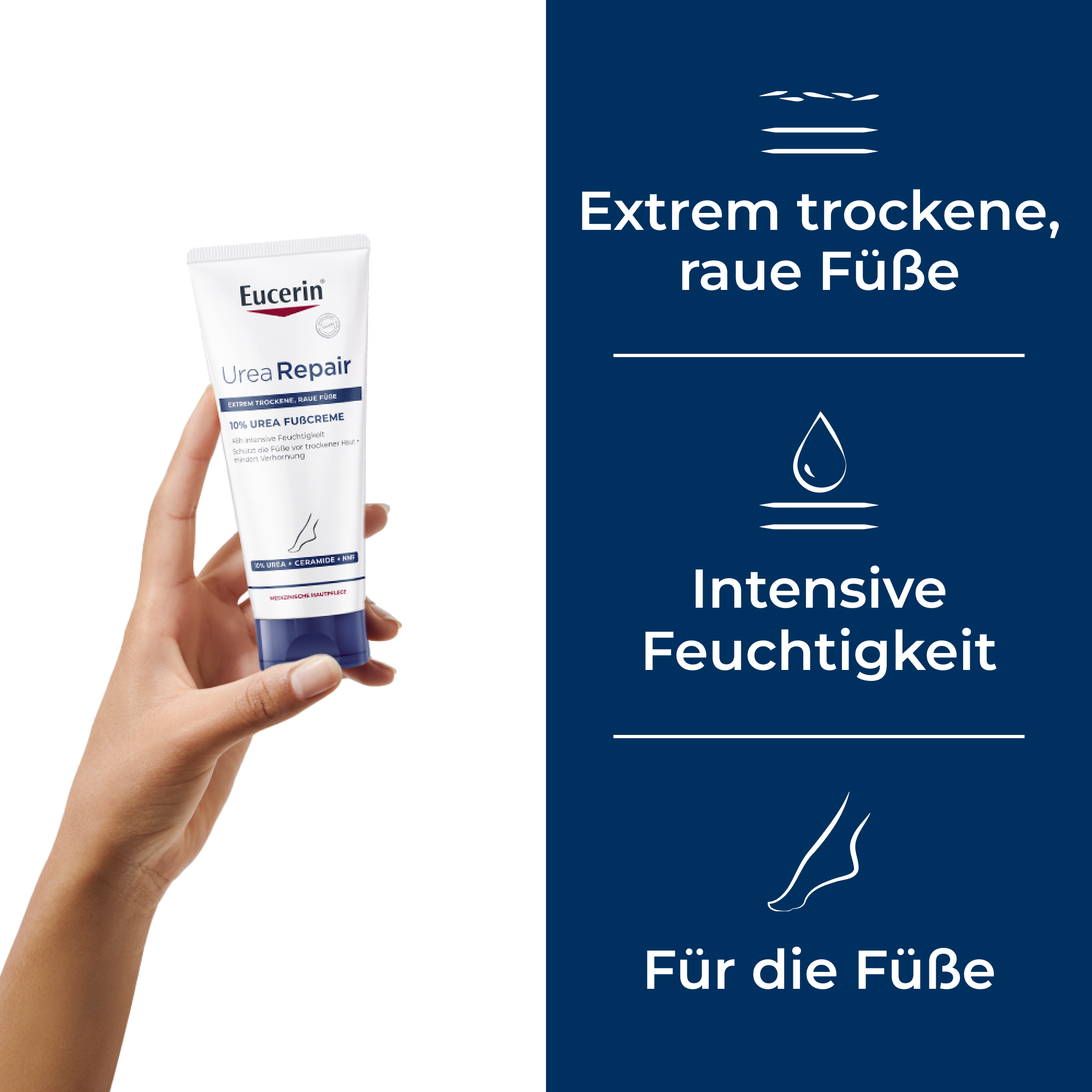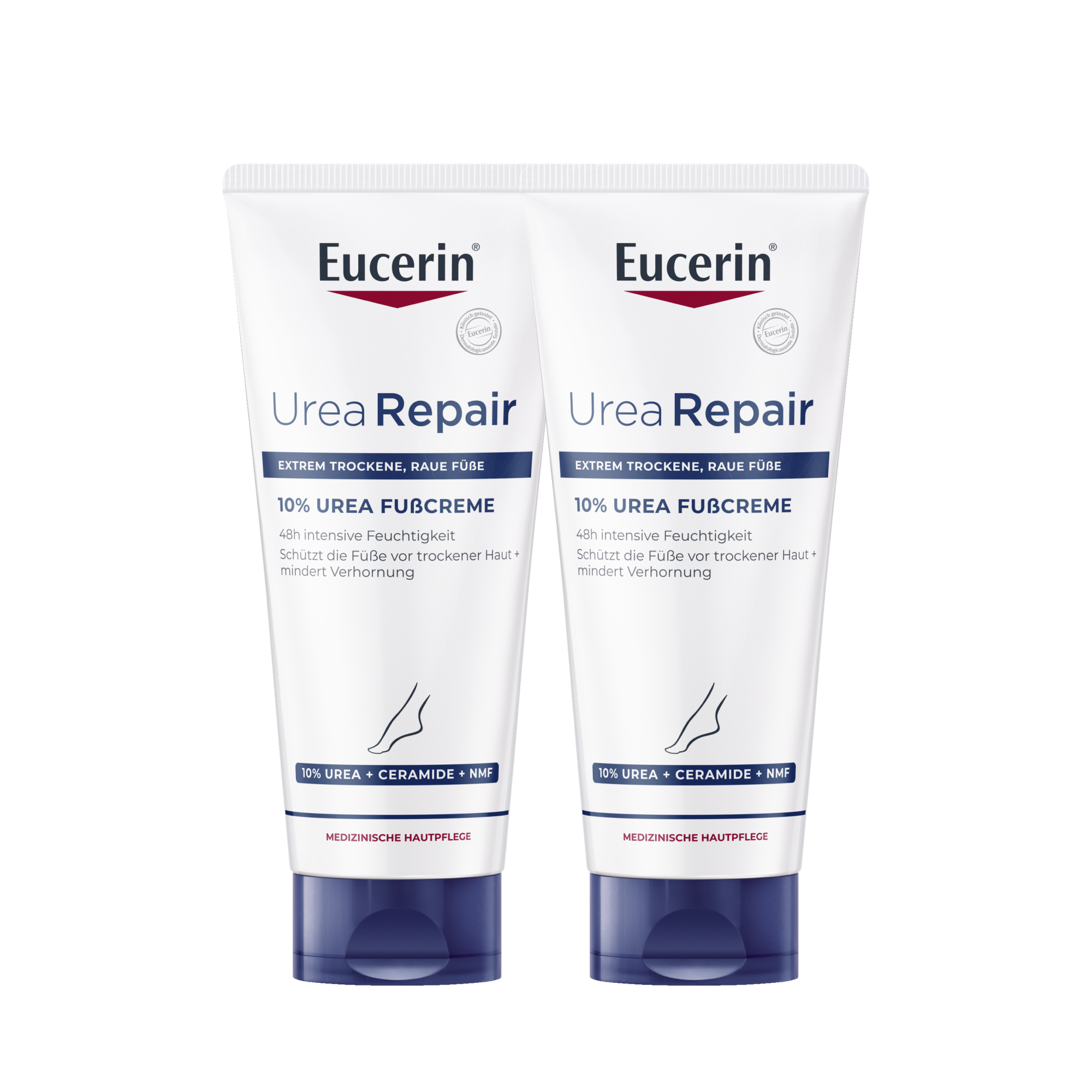 Die Eucerin UreaRepair 10% Urea Fußcreme spendet intensive Feuchtigkeit und lindert so Symptome trockener bis extrem trockener Füße sofort. Sie stärkt die natürliche Hautbarriere, schützt die Haut bis zu 48 Stunden vor trockener Haut und sorgt für langanhaltend glatte Füße.