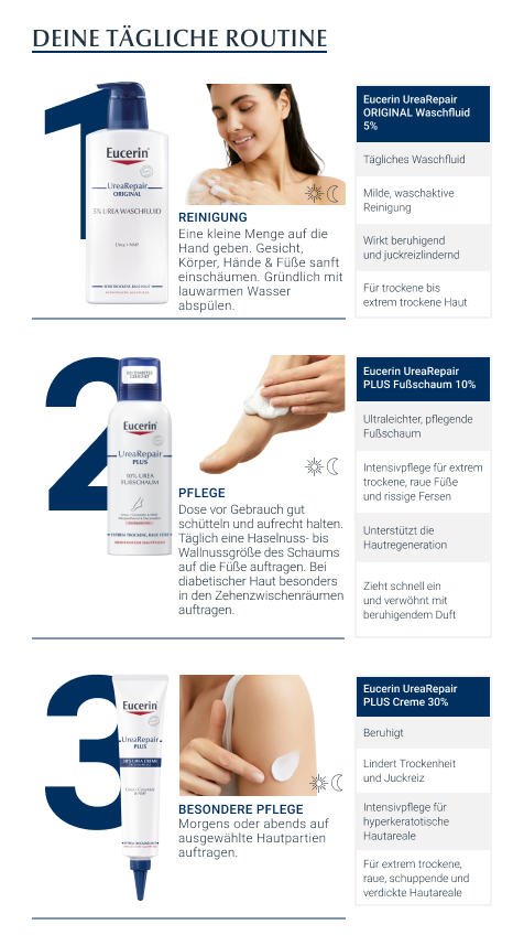 Klinische und dermatologische Studien bestätigen die sehr gute Wirksamkeit und Verträglichkeit der Urea Pflege, auch für die diabetische Haut und beim Tragen von Kompressionsstrümpfen. Im Test stellten 94 % der Anwender fest, dass der neue Eucerin Fußschaum die Füße langanhaltend glättet. 96 % bestätigten, dass die trockene Haut sofort gelindert, regeneriert und revitalisiert wird.*