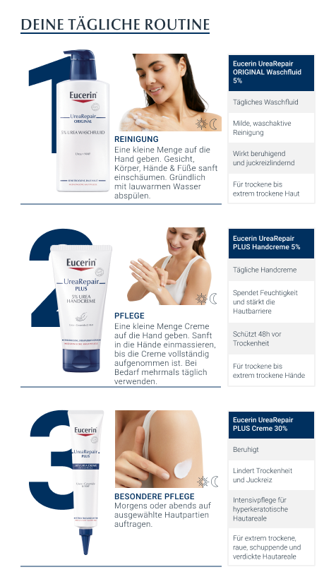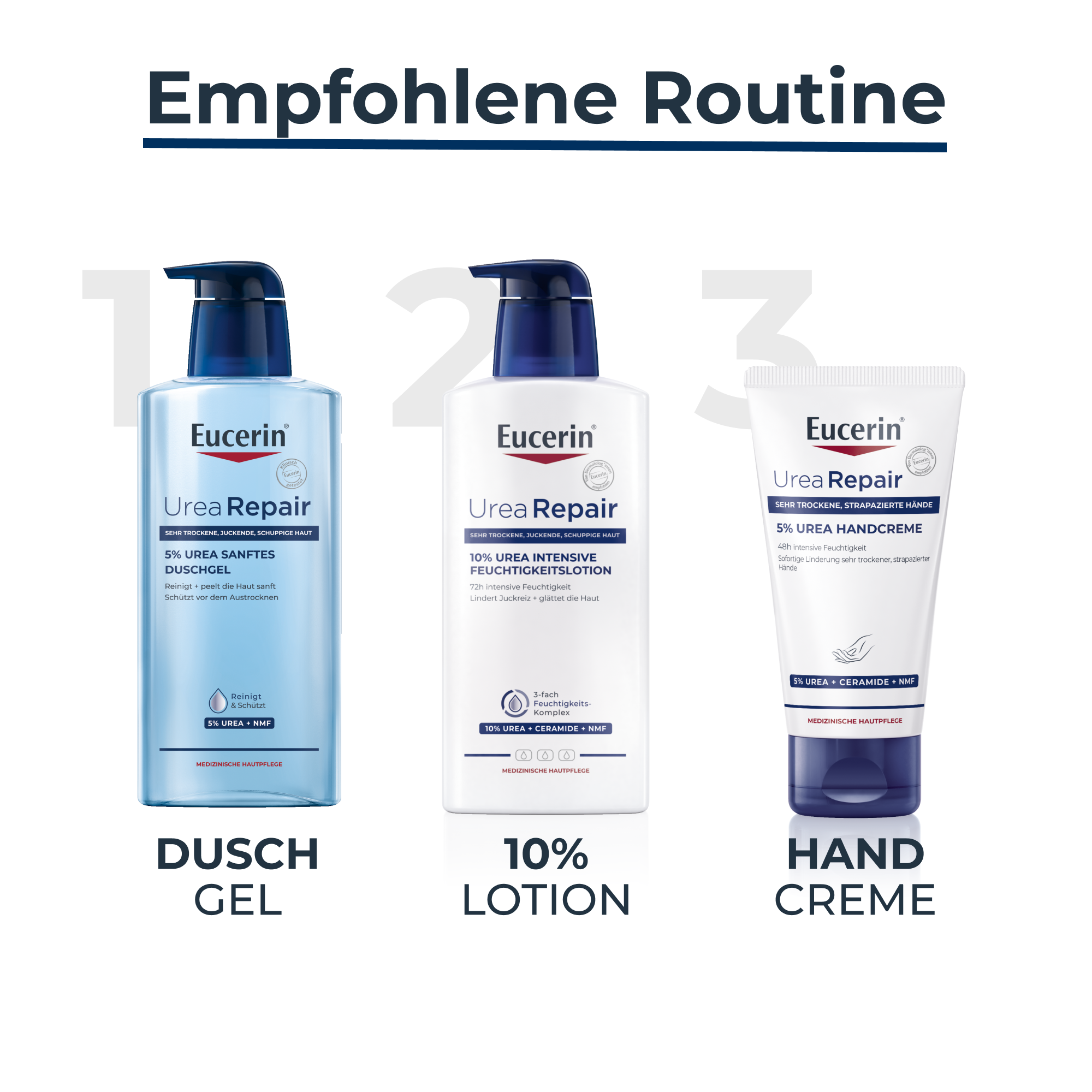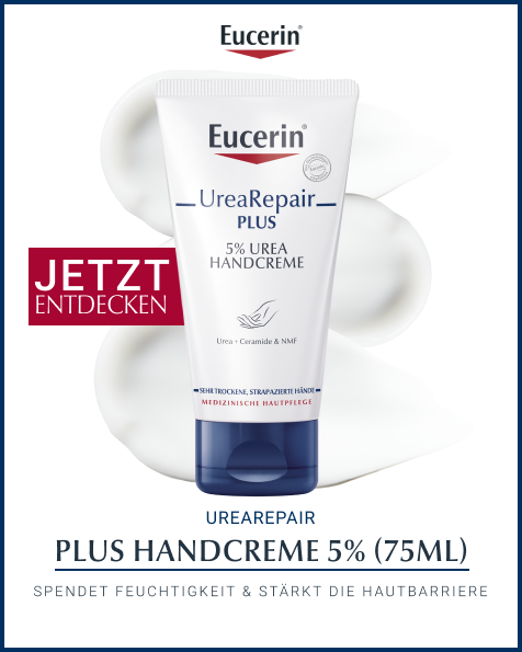 Die schnell einziehende und intensiv pflegende Eucerin UreaRepair PLUS Handcreme 5% spendet Feuchtigkeit und ist die ideale Pflege für sehr trockene, raue und strapazierte Hände. Die Zeichen sehr trockener Haut werden sofort gelindert und die Haut 48 Stunden vor Trockenheit geschützt – für eine gestärkte Hautbarriere und glatte, weiche Hände.