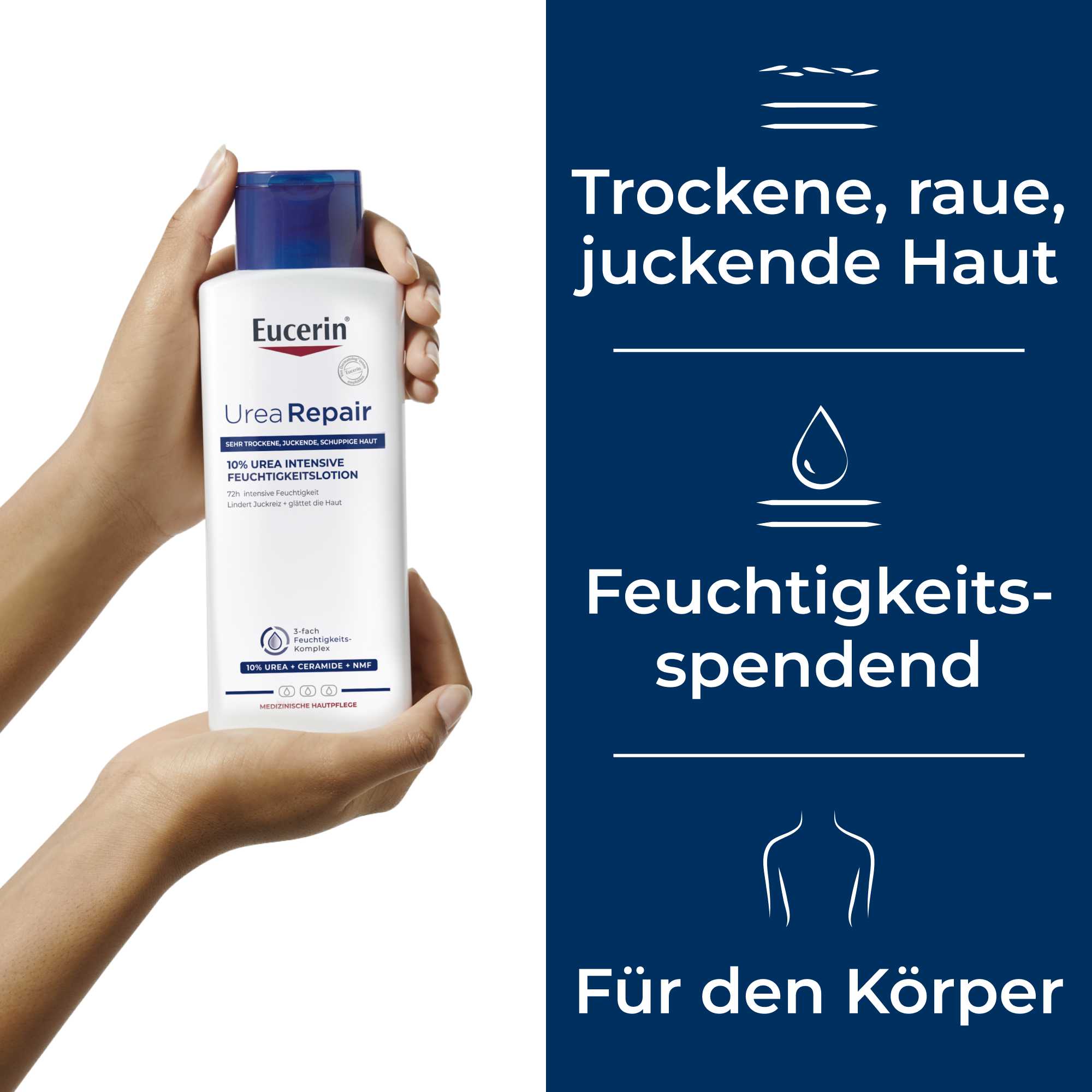 Der Repair-PLUS-Komplex der parfümfreien Bodylotion verbessert die Feuchtigkeitsbindung der Haut und bringt den Lipid-(Fett-) und Feuchtigkeitshaushalt wieder in ein natürliches Gleichgewicht. Dies wird durch die Kombination der Wirkstoffe Urea, Ceramide sowie die natürlichen Feuchthaltefaktoren erreicht. Spannungsgefühl, Juckreiz oder Schuppung werden sofort gelindert. Die Feuchtigkeitscreme ist therapiebegleitend auch zur Pflege z. B. bei diabetischer Haut, Psoriasis und Keratosis pilaris geeignet.