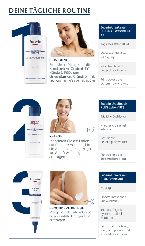 Der Repair-PLUS-Komplex der parfümfreien Bodylotion verbessert die Feuchtigkeitsbindung der Haut und bringt den Lipid-(Fett-) und Feuchtigkeitshaushalt wieder in ein natürliches Gleichgewicht. Dies wird durch die Kombination der Wirkstoffe Urea, Ceramide sowie die natürlichen Feuchthaltefaktoren erreicht. Spannungsgefühl, Juckreiz oder Schuppung werden sofort gelindert. Die Feuchtigkeitscreme ist therapiebegleitend auch zur Pflege z. B. bei diabetischer Haut, Psoriasis und Keratosis pilaris geeignet.