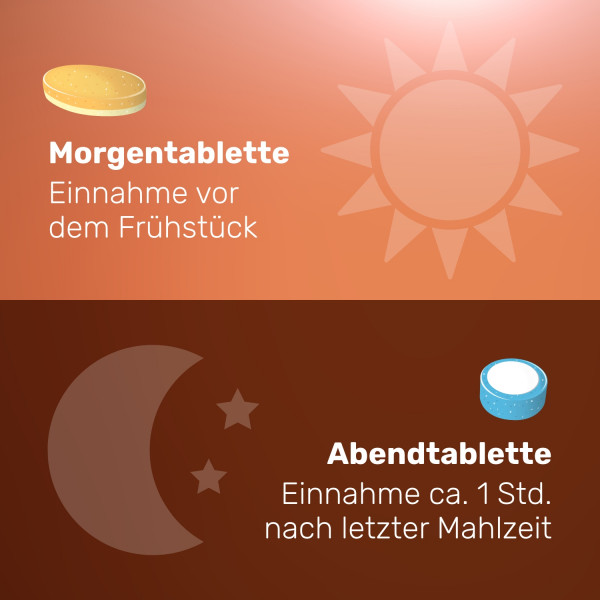 Eine gelb-weiße Morgen-Tablette vor dem Frühstück. Eine blau-weiße Abend-Tablette frühestens eine Stunde nach der letzten Mahlzeit.