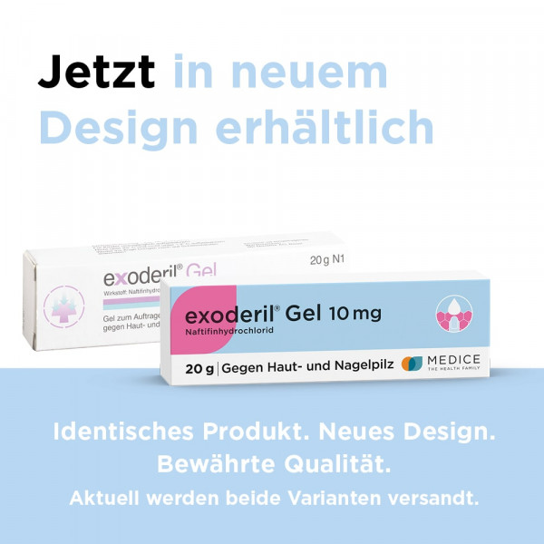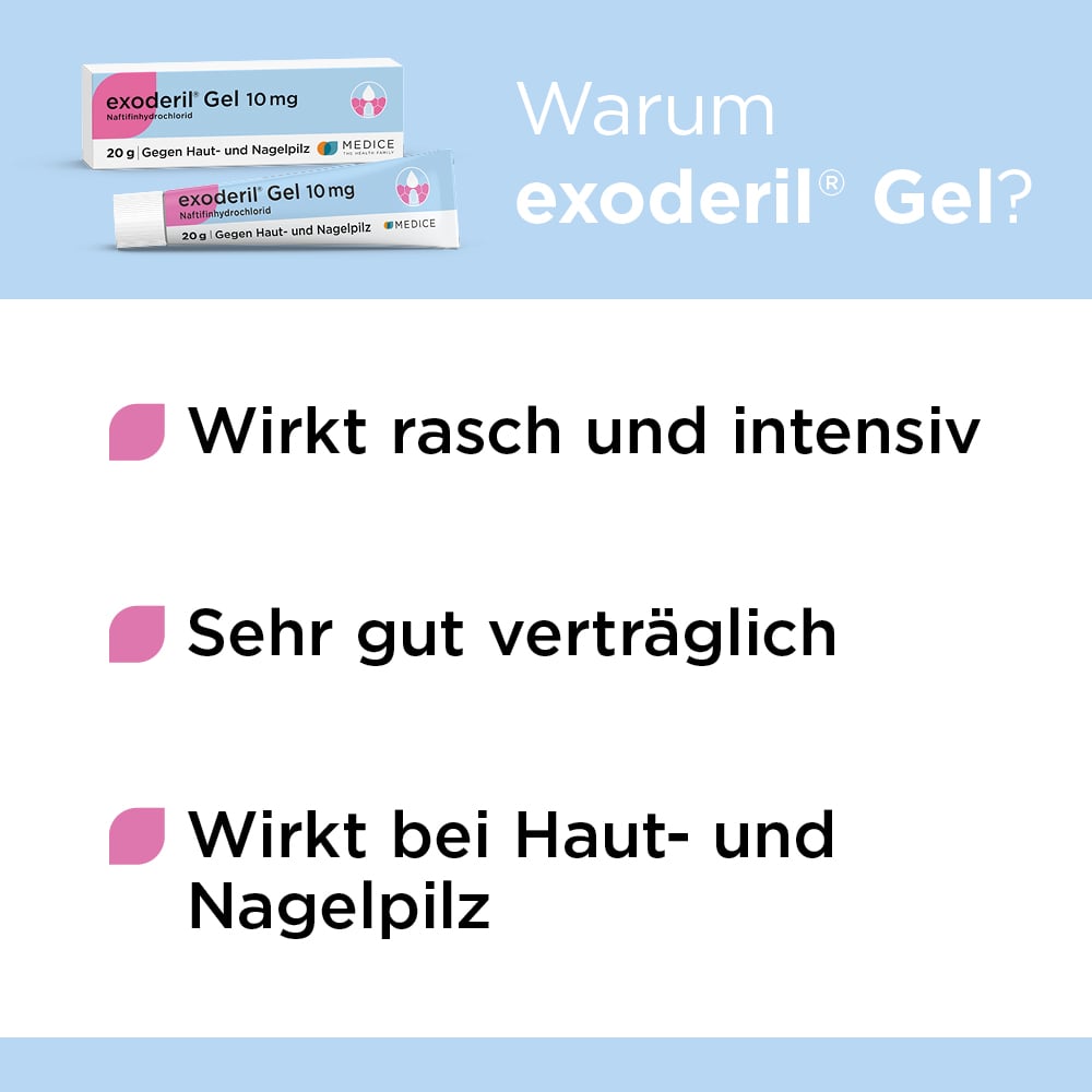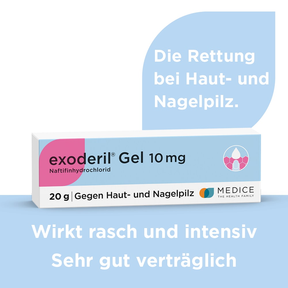 exoderil Gel. Wirkstoff: Naftifinhydrochlorid. Anwendungsgebiete: Pilzinfektionen der Haut (Dermatomykosen), verursacht durch Dermatophyten, Hefe und Schimmelpilze sowie Mischinfektionen mit Bakterien. Bei Pilzinfektionen der Nägel (Onychomykosen) ist ein Behandlungsversuch angezeigt.