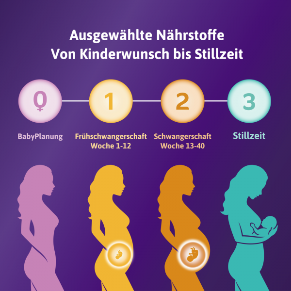 Mit Beginn des ersten Trimesters deiner Schwangerschaft möchtest du deinem Baby einen gesunden Start ins Leben ermöglichen.1Eine Schwangerschaft bereitet dich darauf vor, neues Leben in der Welt willkommen zu heißen. Ab der 1.Woche beginnt das erste Trimester und dein Körper benötigt von vielen Nährstoffen eine größere Menge, um dich und dein Baby zu unterstützen. Femibion® 1 Frühschwangerschaft enthält 800 μg Folsäure Plus¹ (eine Kombination aus Folsäure und Metafolin®), um den Folatspiegeleffektiv zu erhöhen.²Femibion® 1 Frühschwangerschaft enthält zusätzlich ausgewählte Nährstoffe, die auf deine Schwangerschaft abgestimmt sind: Cholin, Eisen, Vitamin B1, B2, B6, B12, C, D, E, Biotin, Niacin, Pantothensäure, Jod, Eisen und Selen. Femibionist die Nr. 1* Empfehlung von Gynäkologinnen und Gynäkologen und bietet ein abgestimmtes Produkt für jede Phase von Kinderwunsch bis Stillzeit.Ausgewählte Nährstoffe von Woche 1 bis 13Eine ausreichende Folsäurezufuhr ist während der gesamten Schwangerschaft, vor allem aber während des ersten Trimesters unerlässlich. Ein niedriger mütterlicher Folatspiegel ist ein Risikofaktor für die Entstehung von Neuralrohrdefekten deines ungeborenen Babys.1Der Folatbedarf bleibt bis zum Ende der Schwangerschaft und während der Stillzeit erhöht. Ausgewählte Vitamine und Mineralstoffe in nur einer Tablette pro Tag¹Femibion®-Produkte enthalten Folsäure Plus (eine Kombination aus Folsäure und Metafolin®) sowie ausgewählte Nährstoffe. Metafolin® ist eine Form von Folat, welche direkt vom Körper aufgenommen werden kann und hilft, den Folatspiegelzu erhöhen, welcher für die gesunde Entwicklung deines Babys wichtig ist.¹ Metafolin® ist eine eingetragene Marke der Merck KGaA, Darmstadt, und wird unter Lizenz verwendet.Die zusätzliche Folsäureaufnahme erhöht den mütterlichen Folatspiegel. Ein niedriger mütterlicher Folatspiegelist ein Risikofaktor für die Entstehung von Neuralrohrdefekten beim heranwachsenden Fötus. Deshalb wird Frauen empfohlen, zusätzlich 400 Folsäure täglich für mindestens einen Monat vor und bis zu drei Monate nach der Empfängnis einzunehmen. Es gibt wissenschaftliche Nachweise, die nahelegen, dass ein niedriger mütterlicher Folatspiegel ein signifikanter Risikofaktor für die Entwicklung von Neuralrohrdefekten ist. Es gibt jedoch auch andere Risikofaktoren. Daher kann die Veränderung eines einzelnen Faktors eine vorteilhafte Wirkung haben oder nicht. Folat bleibt auch in der späteren Schwangerschaft wichtig, da es zum Wachstum des mütterlichen Gewebes (z.B. der Plazenta) beiträgt. Die Plazenta versorgt das Baby mit allen Nährstoffen. Daher sollte während der gesamten Schwangerschaft auf eine ausreichende Folsäurezufuhr geachtet werden.Femibion® 2 und Femibion® 3 enthalten außerdem DHA (mehrfach ungesättigte Omega-3-Fettsäure).