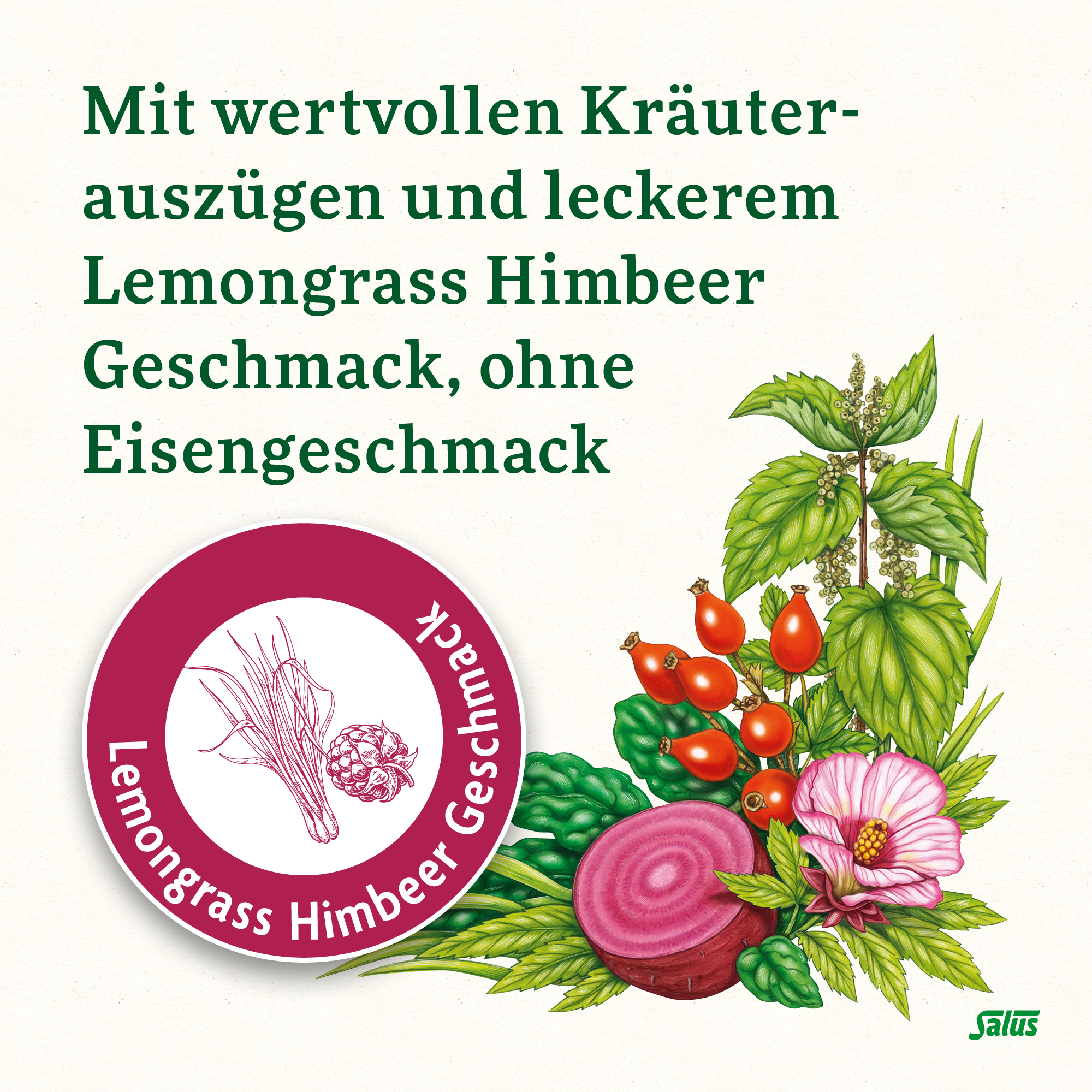 Süßungsmittel Sorbit, Acerolatrockenextrakt, Kräutermischung (11 %) (aus Hagebuttenschalen, Spinat, Brennnesselblättern, Hibiskusblüten und Lemongrass (20 %)), Stärke, Eisenpyrophosphat, Trennmittel Magnesiumsalze der Speisefettsäuren, Rote Bete-Pulver, natürliches Himbeeraroma, L-Ascorbinsäure (Vit. C), Pteroylmonoglutaminsäure (Folsäure), Nicotinamid (Vit. B3), Cyanocobalamin (Vit. B12), Pyridoxinhydrochlorid (Vit. B6), Thiaminhydrochlorid (Vit. B1), Riboflavin (Vit. B2), Stabilisator Lecithin.