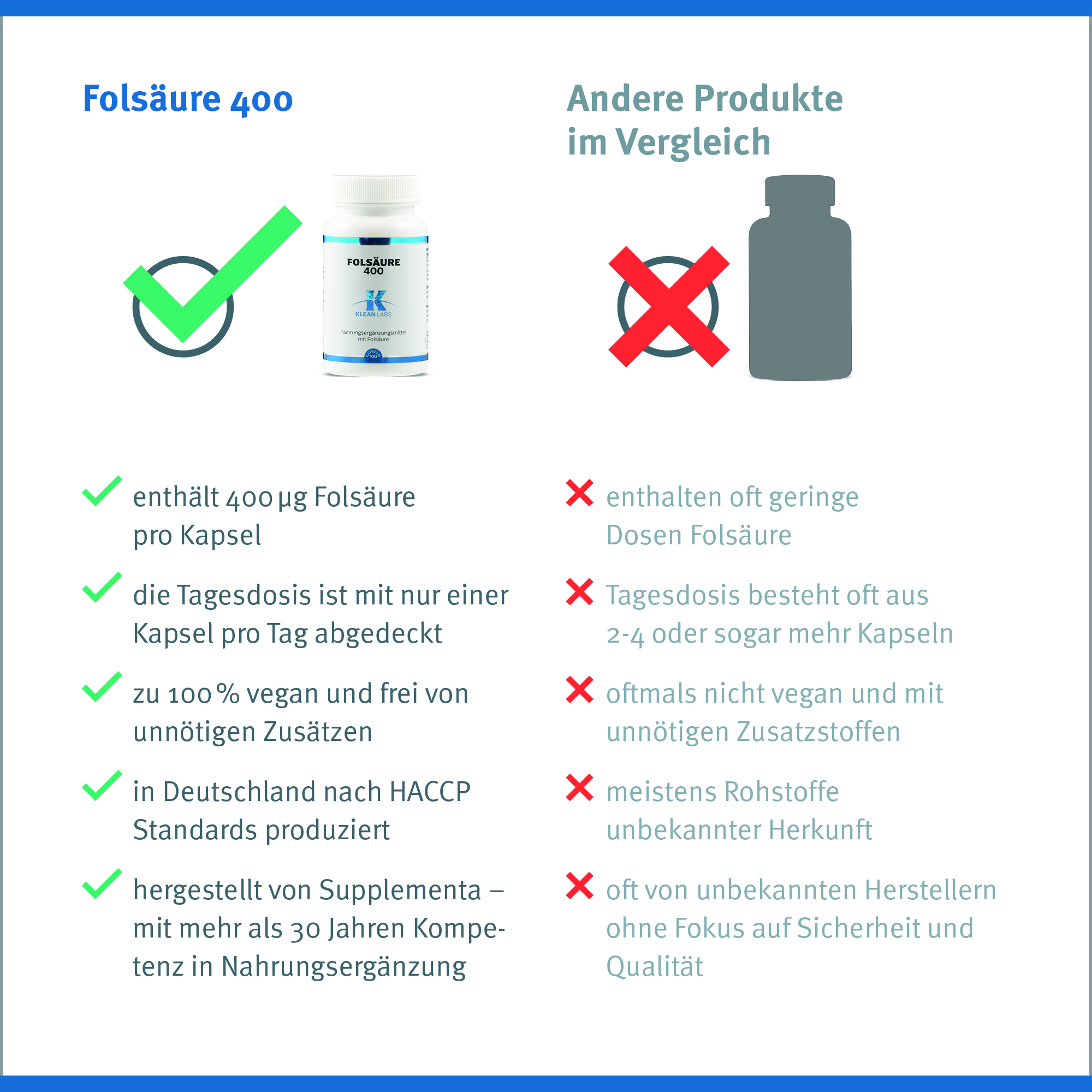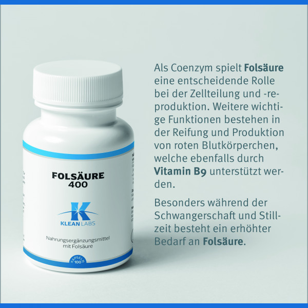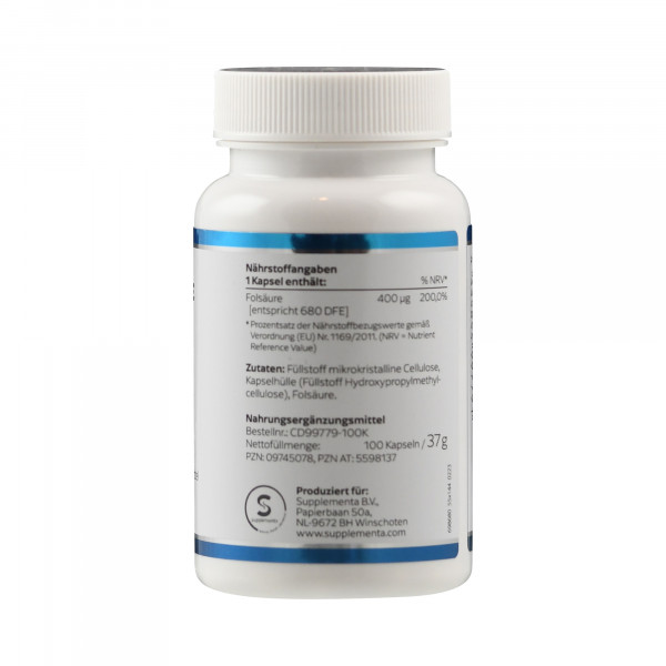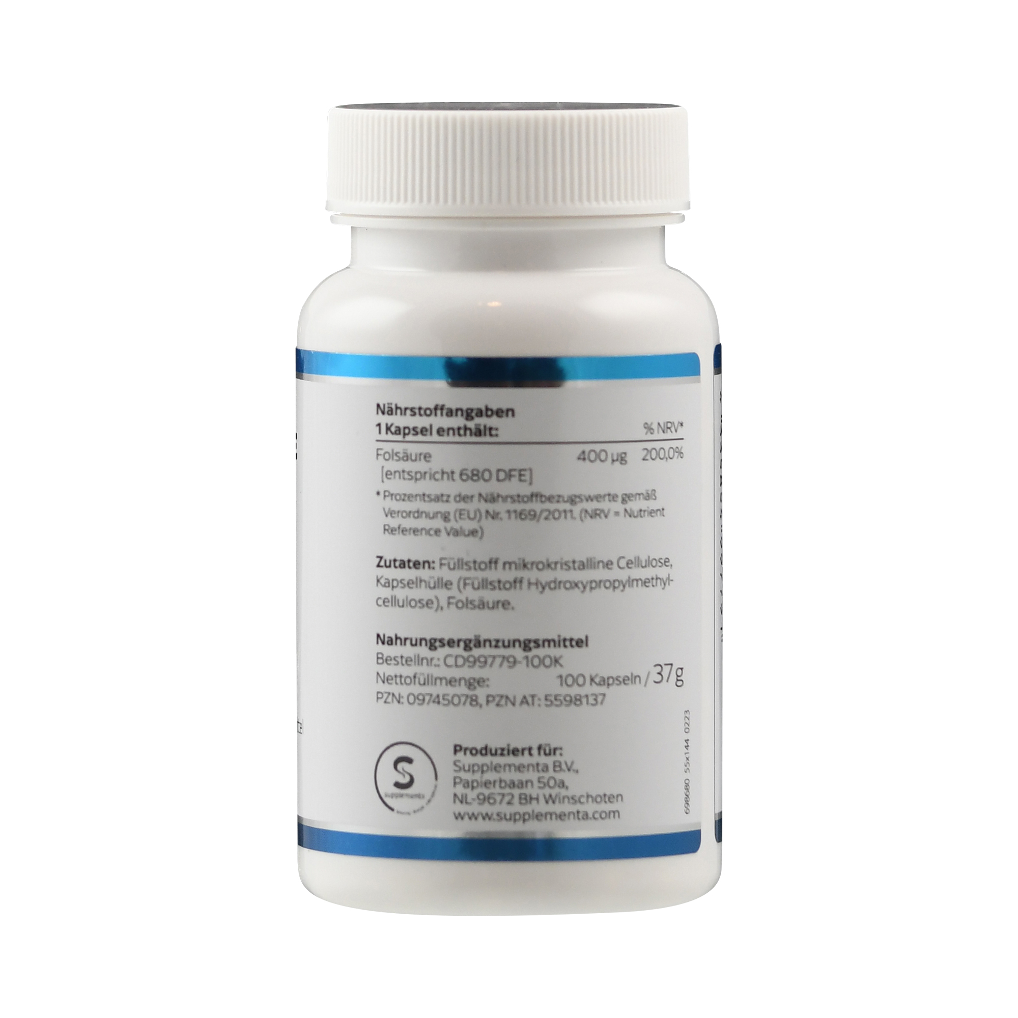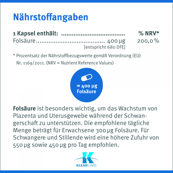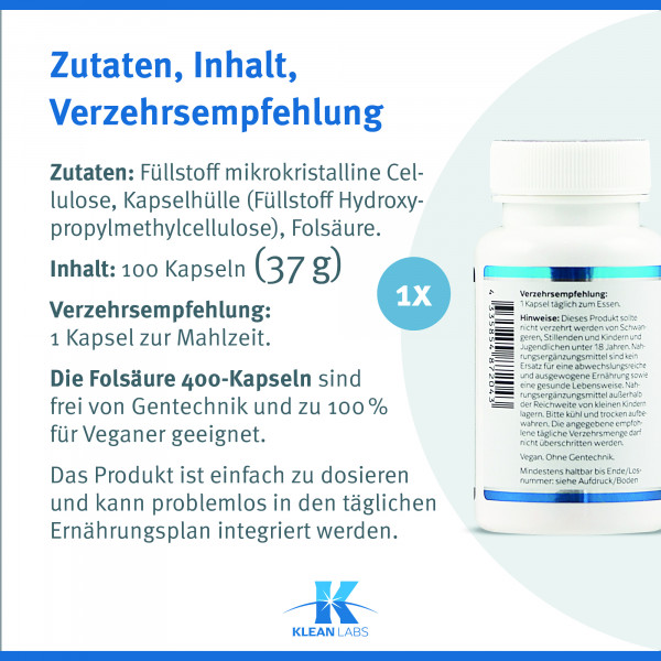 Füllstoff mikrokristalline Cellulose, Kapselhülle Vegetarische Kapsel (Hydroxypropylmethylcellulose, Wasser), Folsäure, Antioxidationsmittel Fettsäureester der Ascorbinsäure.