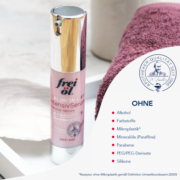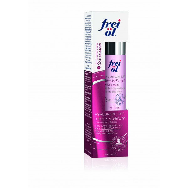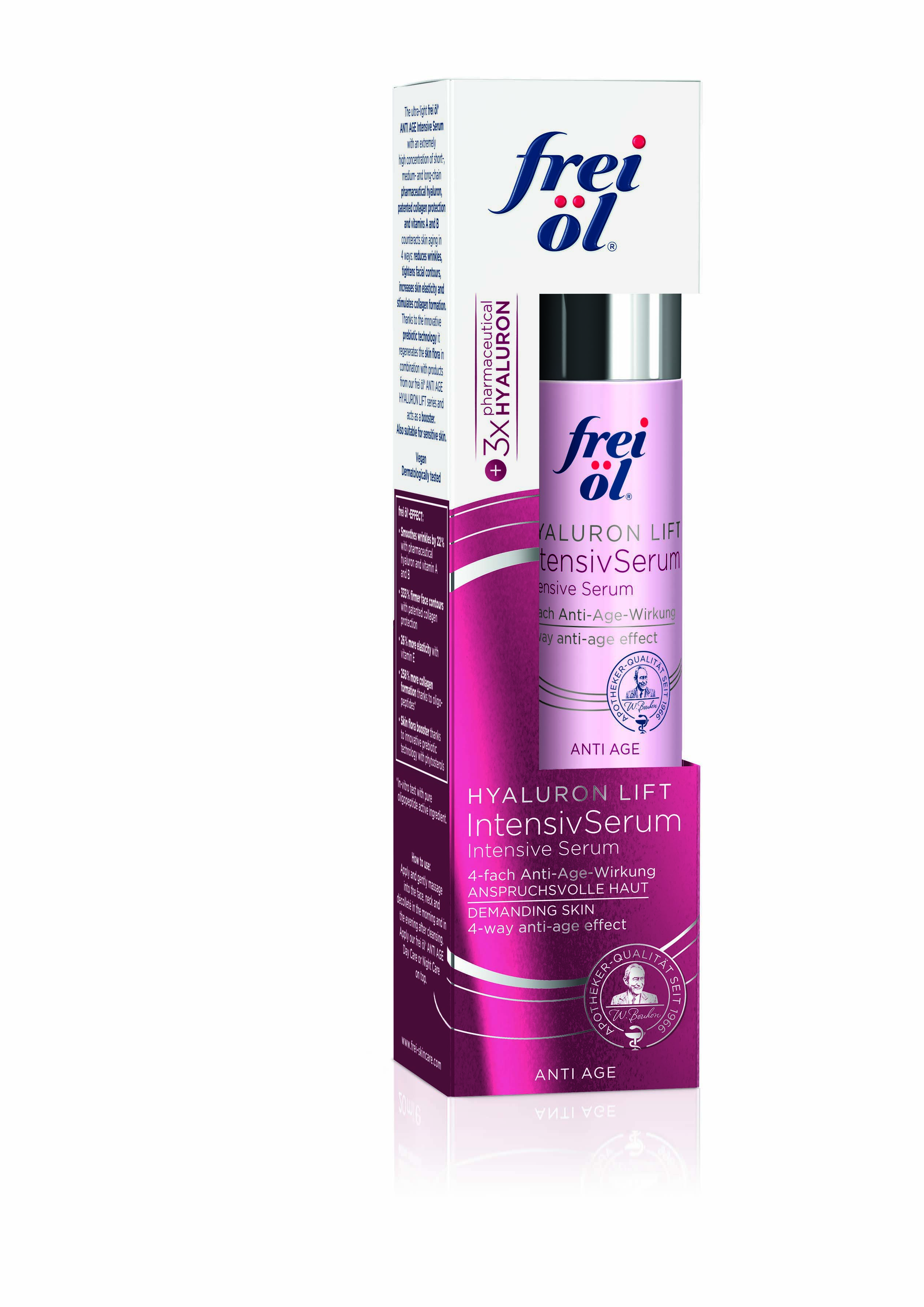 mit der extrem hohen Konzentration aus kurz-, mittel- und langkettigem, pharmazeutischem Hyaluron, patentiertem Kollagenschutz und Vitaminen A und B wirkt 4-fach der Hautalterung entgegen: mindert Falten, strafft die Gesichtskonturen, erhöht die Hautelastizität und regt die Kollagenbildung an. Dank der innovativen präbiotischen Technologie regeneriert es in Kombination mit Produkten aus unserer frei öl® ANTI AGE HYALURON LIFT-Serie die Hautflora und wirkt wie ein Booster. Auch für sensible Haut geeignet.