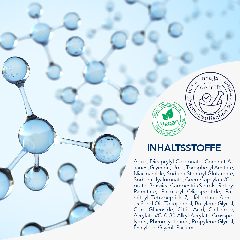 Aqua, Dicaprylyl Carbonate, Coconut Alkanes, Glycerin, Urea, Tocopheryl Acetate, Niacinamide, Sodium Stearoyl Glutamate, Sodium Hyaluronate, Coco-Caprylate/Caprate, Brassica Campestris Sterols, Retinyl Palmitate, Palmitoyl Oligopeptide, Palmitoyl Tetrapeptide-7, Helianthus Annuus Seed Oil, Tocopherol, Butylene Glycol, Coco-Glucoside, Citric Acid, Carbomer, Acrylates/C10-30 Alkyl Acrylate Crosspolymer, Phenoxyethanol, Propylene Glycol, Decylene Glycol, Parfum.