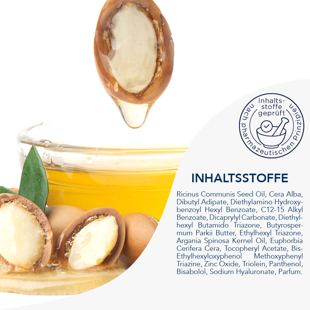 Ricinus Communis Seed Oil, Cera Alba, Dibutyl Adipate, Diethylamino Hydroxybenzoyl Hexyl Benzoate, C12-15 Alkyl Benzoate, Dicaprylyl Carbonate, Diethylhexyl Butamido Triazone, Butyrospermum Parkii Butter, Ethylhexyl Triazone, Argania Spinosa Kernel Oil, Euphorbia Cerifera Cera, Tocopheryl Acetate, Bis-Ethylhexyloxyphenol Methoxyphenyl Triazine, Zink Oxide, Triolein, Panthenol, Bisabolol, Sodium Hyaluronate, Parfum.