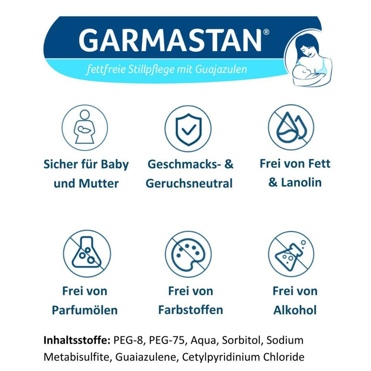 Garmastan® fettfreie, vegane Salbe zur Pflege und zum Schutz von Brustwarzen und Warzenhöfen vor und während der Stillzeit. Die bewährte Rezeptur mit Guajazulen hält die empfindliche Haut geschmeidig und beugt kleinen Rissen vor. Die Stillsalbe ist ohne Duftstoffe und somit geruchsneutral, frei von Farbstoffen, Parfümölen und Wollwachsalkoholen. Garmastan® ist sicher für Baby und Mutter – sie muss vor dem Stillen nicht entfernt werden. Bei Bedarf lässt sie sich ohne Rückstände leicht abwaschen.