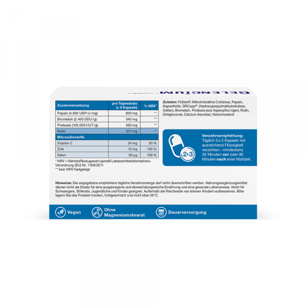 Füllstoff: Mikrokristalline Cellulose, Papain, Kapselhülle: DRCaps® (Hydroxypropylmethylcellulose, Gellan), Bromelain, Protease (aus Aspergillus niger), Rutin, Zinkgluconat, Calcium Ascorbat, Natriumselenit
