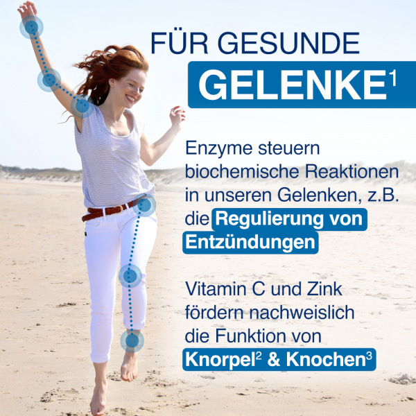 Abgerundet wird GELENCIUM® Enzym Complex durch essenzielle Mikronährstoffe: Vitamin C, Zink und Selen. Die Vitamine und Mineralstoffe sind hochdosiert enthalten, perfekt aufeinander abgestimmt und leisten einen wichtigen Beitrag zur Erhaltung einer normalen Knorpel1- und Knochenfunktion2. Darüber hinaus unterstützen sie das Immunsystem5, den Energiestoffwechsel6 und Zellschutz7. Ein weiterer Vorteil: Das enthaltene Vitamin C stammt aus einer ph-neutralen Quelle und ist damit besonders magenschonend und verträglich – ein Segen insbesondere für die Daueranwendung.