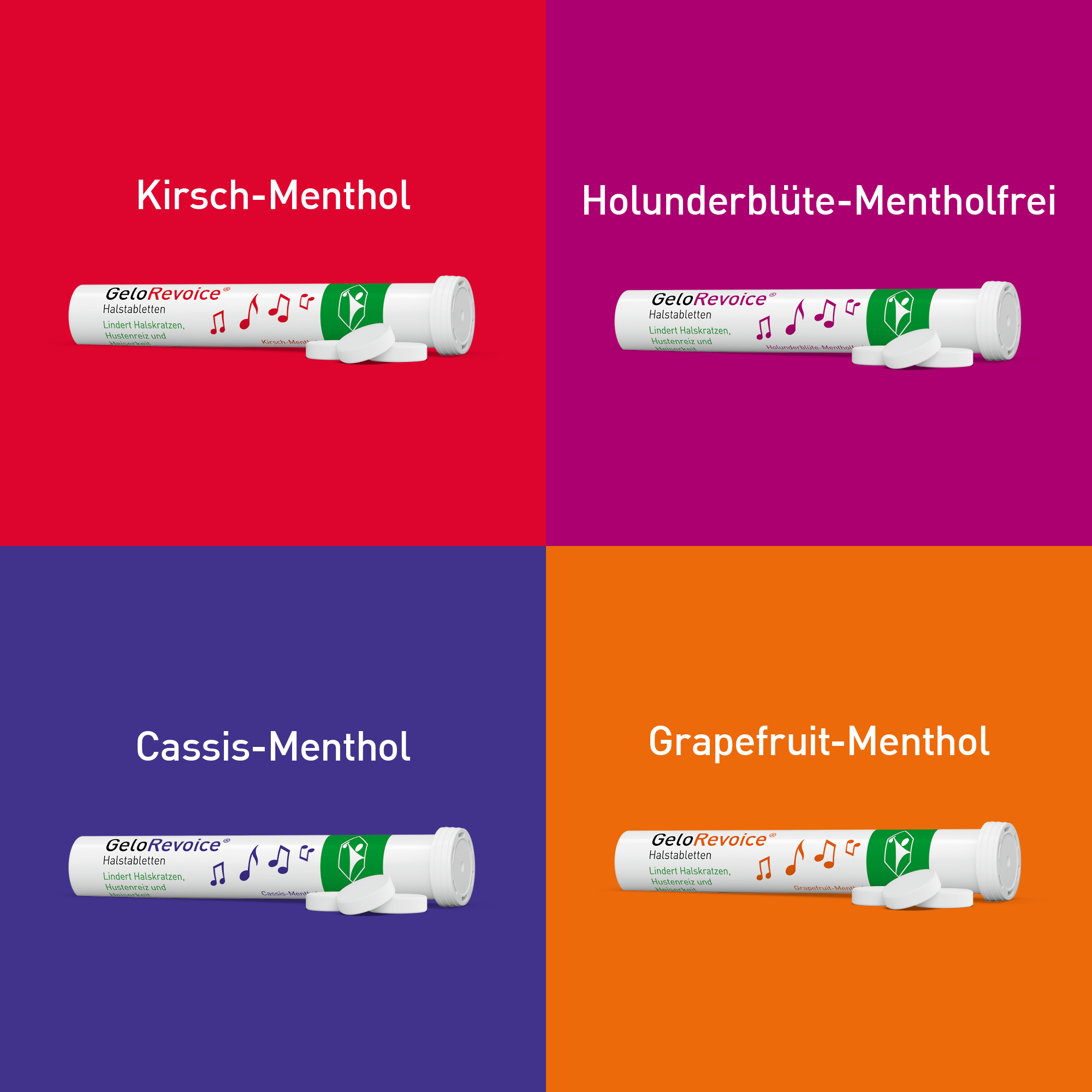 In welchen Geschmacksrichtungen gibt es GeloRevoice® Halstabletten? GeloRevoice® gibt es in den vier Geschmacksvarianten: fruchtiges Kirsch-Menthol, aromatisches CassisMenthol und frisches Grapefruit-Menthol sowie liebliches Holunderblüte-Mentholfrei. Tipp für alle, die GeloRevoice® regelmäßig lutschen: Probieren Sie alle vier Sorten, so sorgen Sie für geschmackliche Abwechslung und finden Ihre Lieblingsvariante.