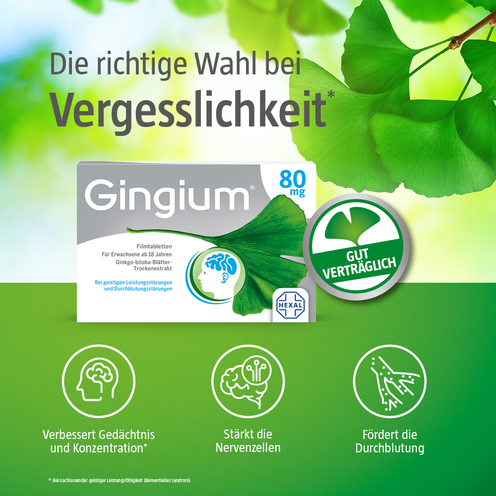 Gingium® spezial 80 mg wird angewendet zur symptomatischen Behandlung von hirnorganisch bedingten geistigen Leistungseinbußen. Die Anwendung erfolgt im Rahmen eines therapeutischen Gesamtkonzeptes bei fortschreitender Abnahme bzw. Verlust erworbener geistiger Fähigkeiten (dementielles Syndrom) mit den Hauptbeschwerden: Gedächtnisstörungen, Konzentrationsstörungen, Niedergeschlagenheit, Schwindel, Ohrensausen, Kopfschmerzen. Das individuelle Ansprechen auf die Medikation kann nicht vorausgesagt werden.