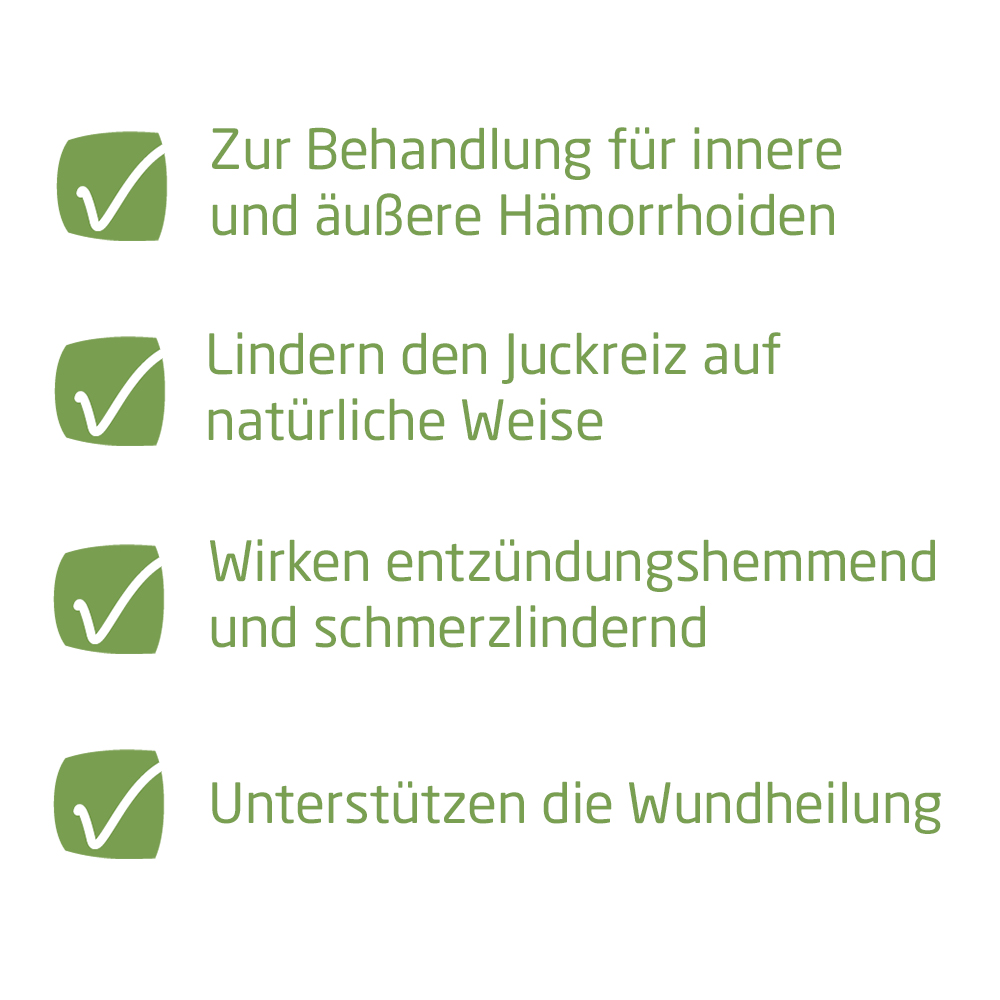 Weleda Hämorrhoidalzäpfchen strukturieren die schmerzhaft erweiterten Blutgefäße und geben ihnen neue Spannkraft. Die Gefäße können sich wieder zusammenziehen, eine schnellere Wundheilung wird ermöglicht. Die Wirkstoffe Rosskastanie, Zaubernuss und Stibium metallicum praeparatum wirken entzündungshemmend und dadurch schmerzlindernd. Sie unterstützen die Heilung der entzündeten Haut und lindern den unangenehmen Juckreiz.
