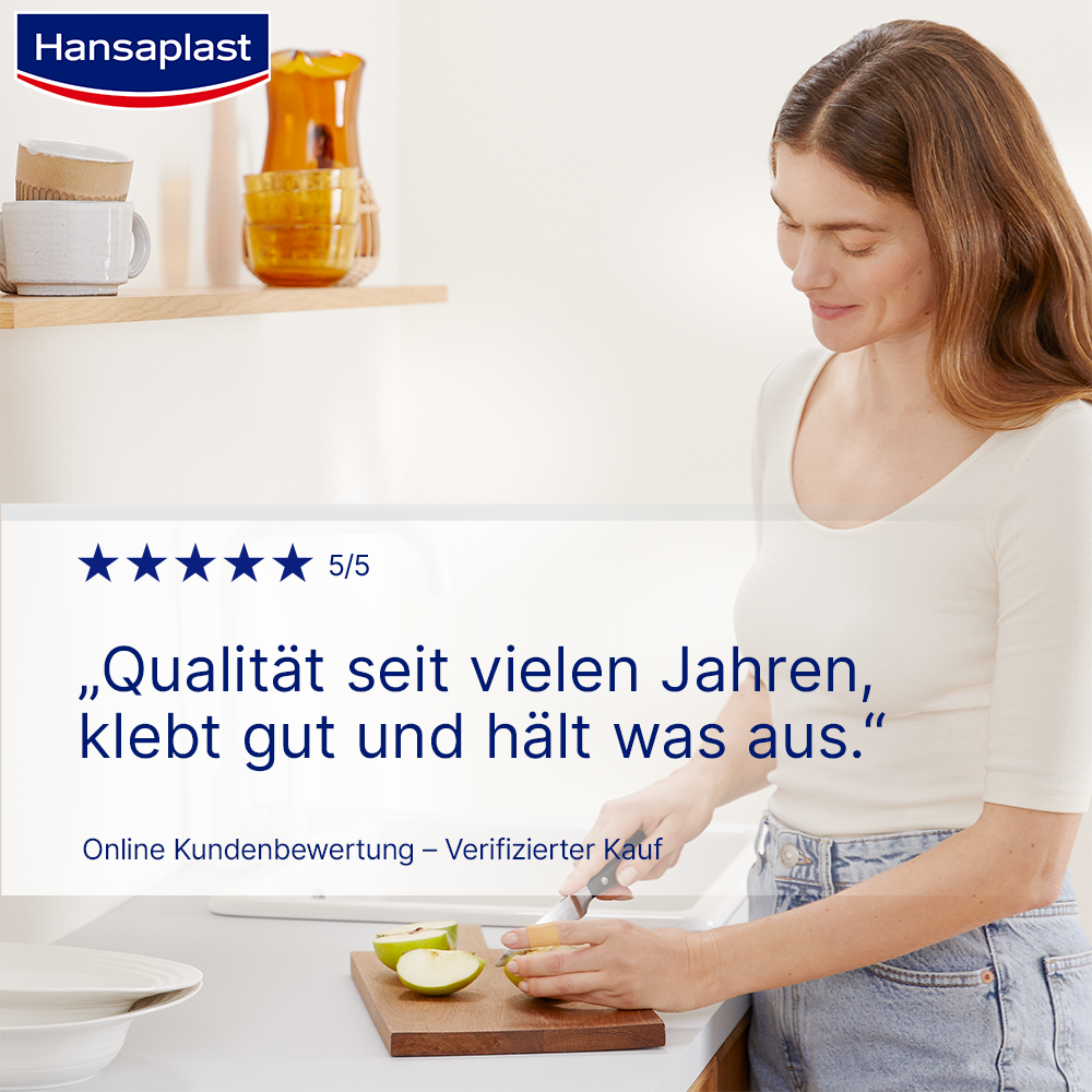Das Hansaplast Classic Pflaster erhalten Sie als praktische Meterware – so können Sie sich die benötigte Größe einfach mit einer Schere individuell zuschneiden.