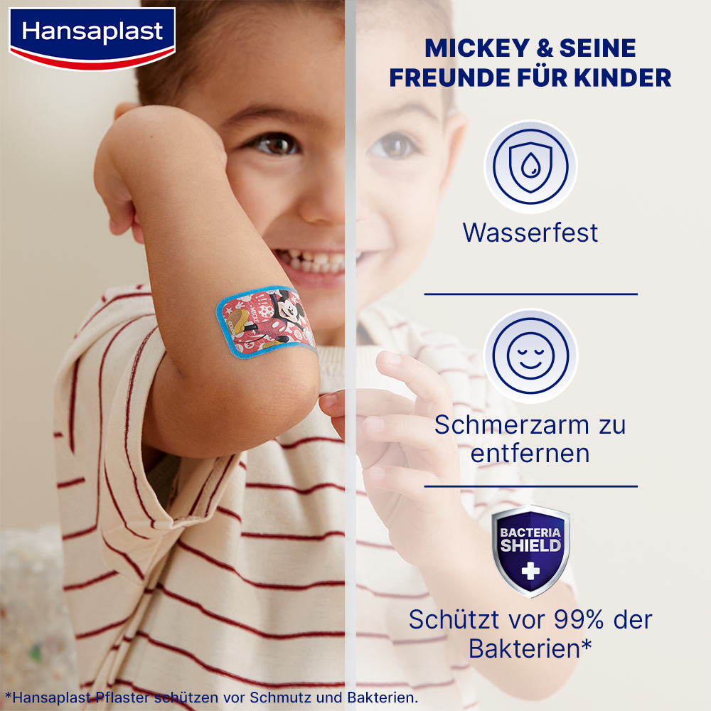 Mit den Hansaplast Kids Pflastern und den Lieblingsmotiven von Mickey Mouse, Donald Duck und vielen anderen Freunden sind kleine Kratzer, Schnitt- und Schürfwunden schnell wieder vergessen. Das Hansaplast Bacteria Shield schützt vor Schmutz und 99% der Bakterien.
