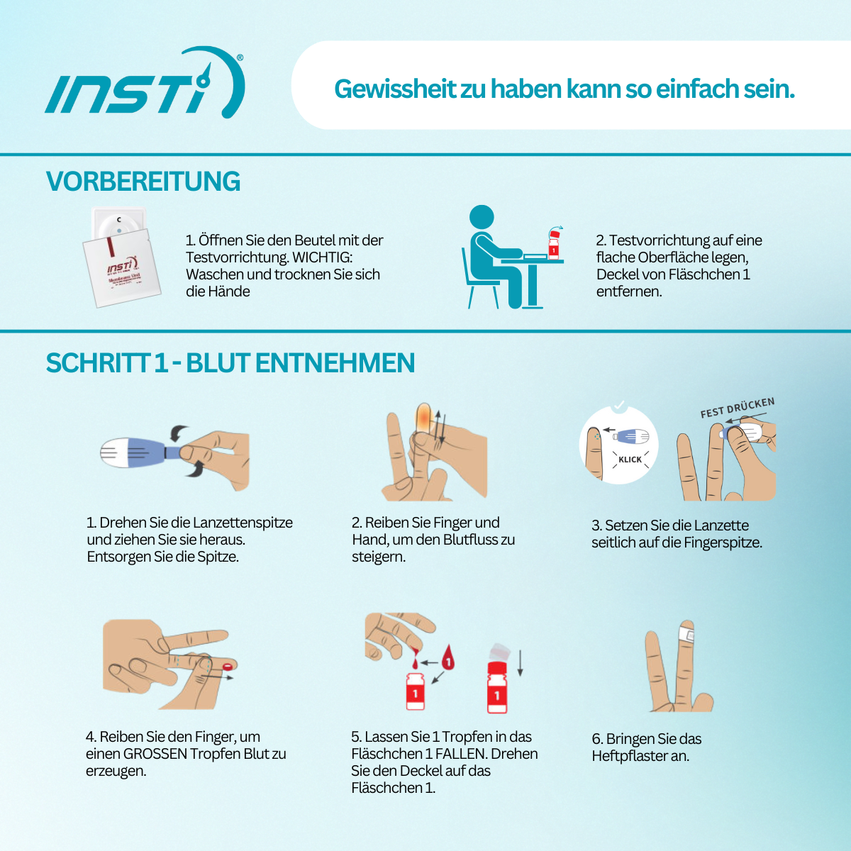 Vorbereitung: Lesen Sie die Anleitung sorgfältig durch und stellen Sie sicher, dass alle Komponenten bereitliegen. Blutentnahme: Verwenden Sie die beiliegende Lanzette, um einen kleinen Tropfen Blut zu entnehmen. Testdurchführung: Geben Sie den Blutstropfen auf die Testkarte und folgen Sie den weiteren Anweisungen. Ergebnis: Lesen Sie das Ergebnis nach 60 Sekunden ab.
