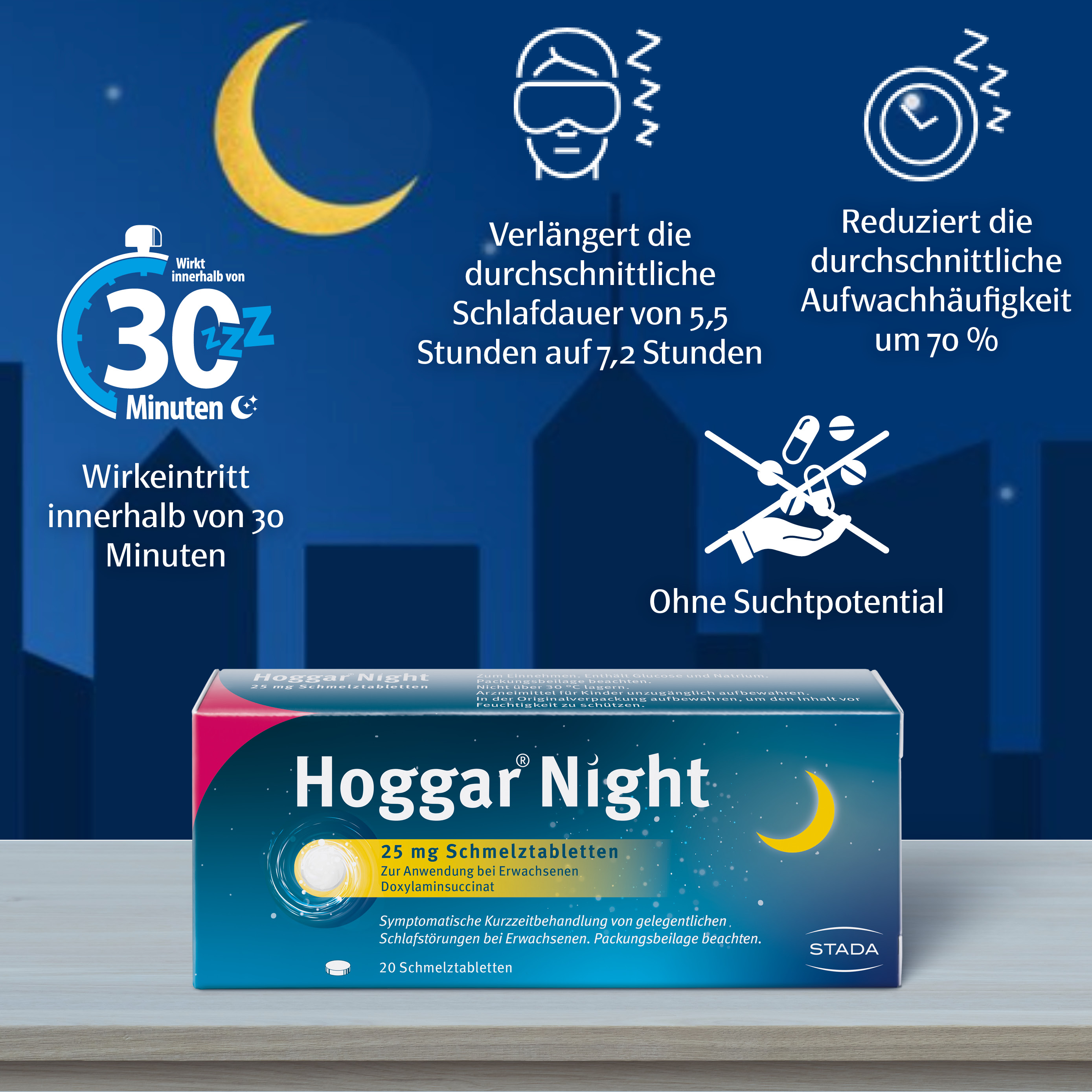 Hoggar Night 25 mg Schmelztabletten. Wirkstoff: Doxylaminsuccinat. Anwendungsgebiete: zur symptomatischen Kurzzeitbehandlung von gelegentlichen Schlafstörungen bei Erwachsenen.