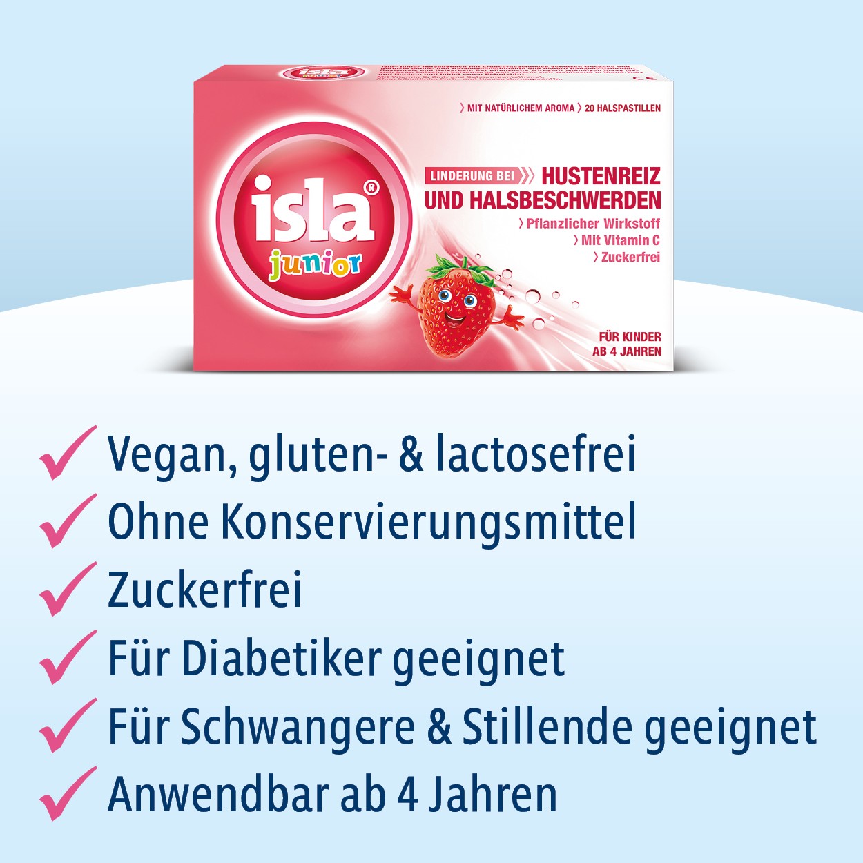 isla junior Halspastillen mit Erdbeergeschmack sind zur Anwendung bei Kindern ab 4 Jahren geeignet. Sie schützen die trockenen und gereizten Mund- und Rachenschleimhäute und lindern typische Erkältungs- und Halsbeschwerden.
