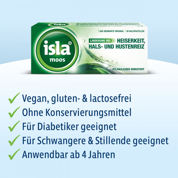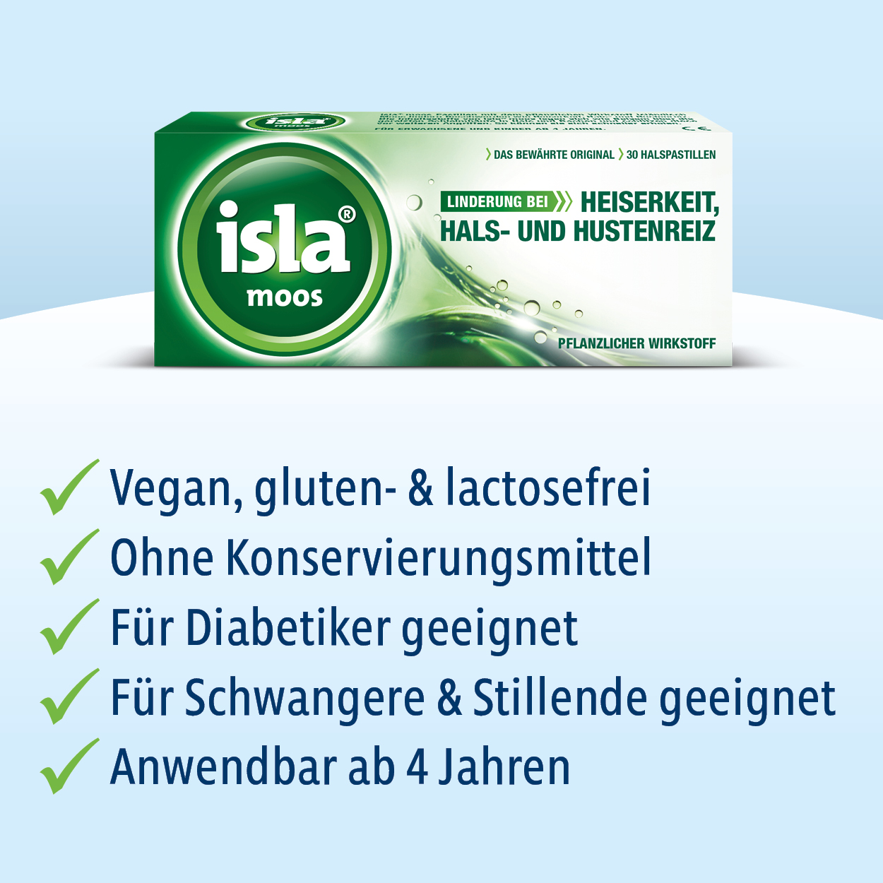 Die Inhaltsstoffe von Isla-Moos legen sich wie Balsam über die Schleimhaut in Hals und Rachen. So wird sie vor weiteren Angriffen geschützt und die gereizte Schleimhaut kann sich durch die wohltuende Wirkung schneller erholen, insbesondere bei Beschwerden im Hals durch Hustenreiz und Heiserkeit, starke Beanspruchung der Stimmbänder (Sänger, Redner), trockene Atemluft (geheizt oder klimatisiert), Mundtrockenheit und eingeschränkte Nasenatmung.