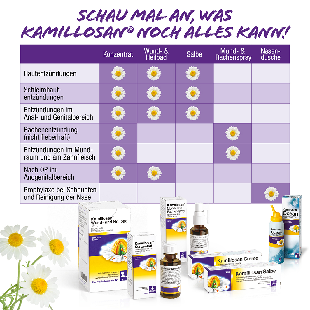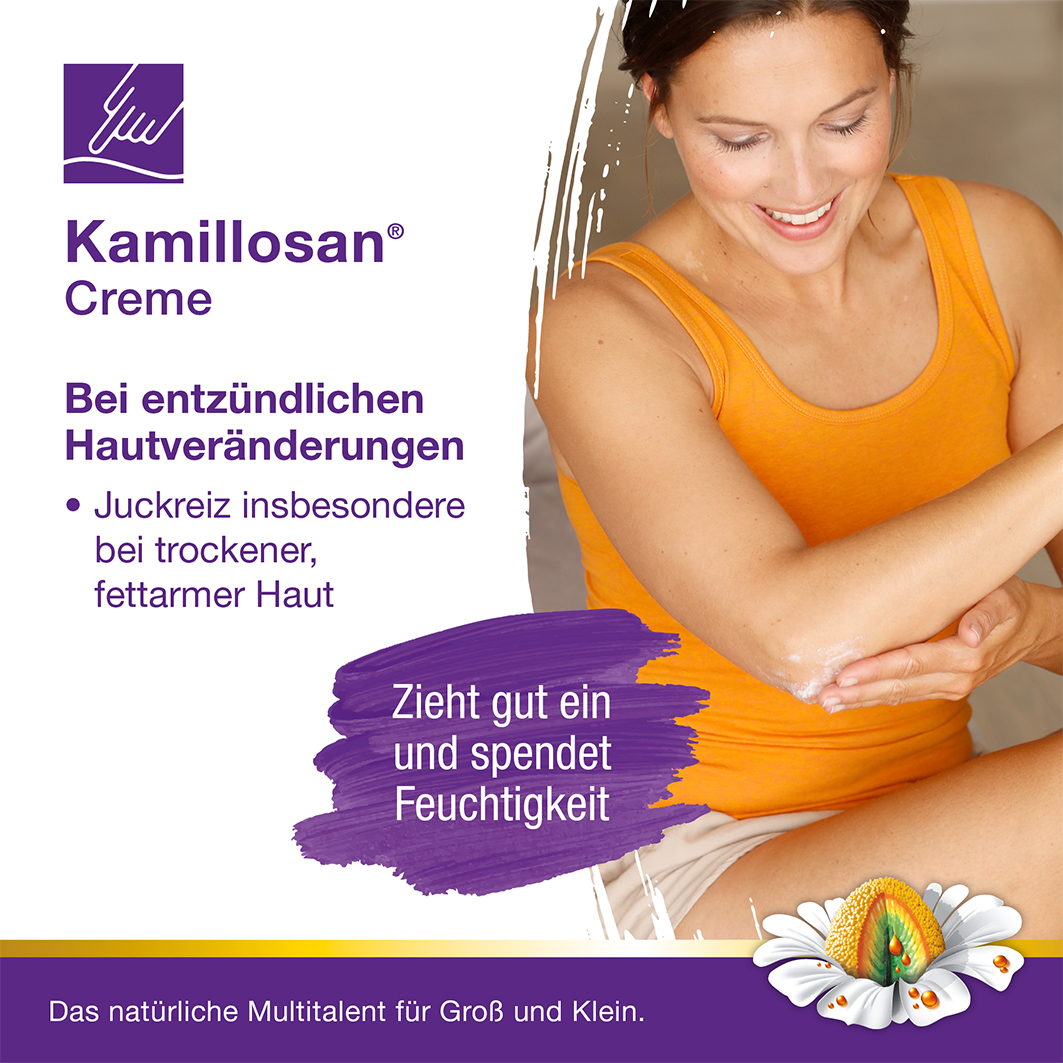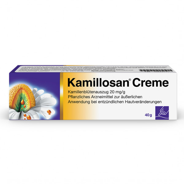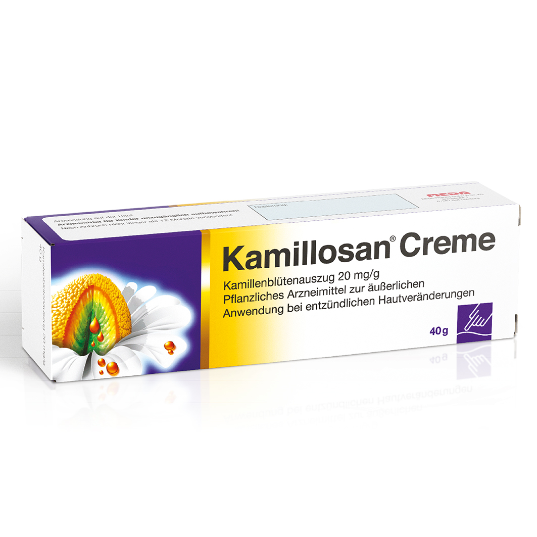 Kamillosan Creme. Auszug aus Kamillenblüten (Matricaria recutita L.) (2,7-5,5:1) 20 mg. Anwendungsgebiet: Kamillosan Creme wird angewendet zur Nachbehandlung im Anschluss an eine lokale Kortikoidtherapie entzündlicher Hauterkrankungen, u.a. verschiedener Ekzemformen wie z. B. Kontaktekzem, Gewerbeekzem, Ekzem bei Kindern, Neurodermitis (atopisches Ekzem).