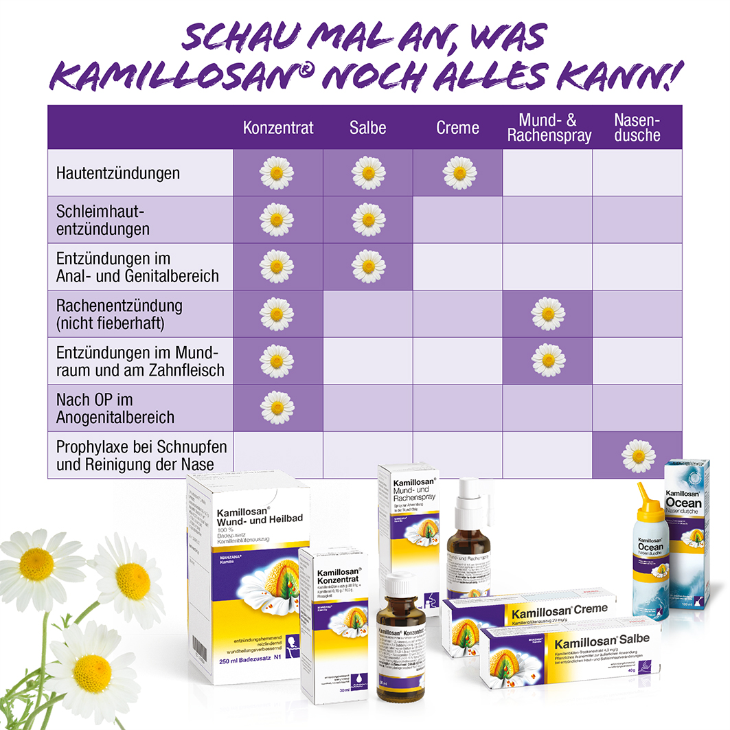 Anwendung: Für Umschläge, Spülungen und Bäder bei Haut- und Schleimhautentzündungen.