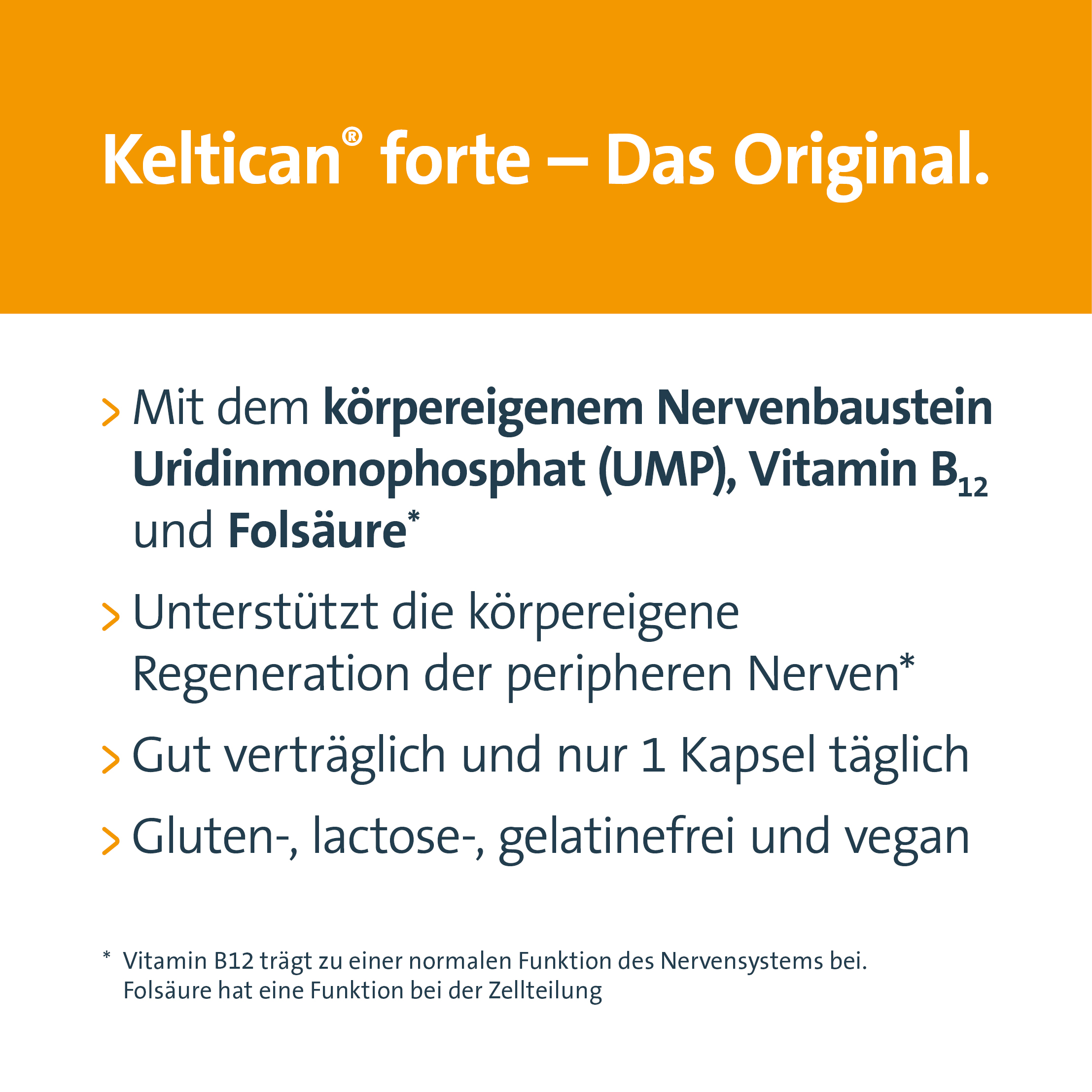 Keltican® forte ist ein Nahrungsergänzungsmittel mit Uridinmonophosphat, Folsäure und Vitamin B12