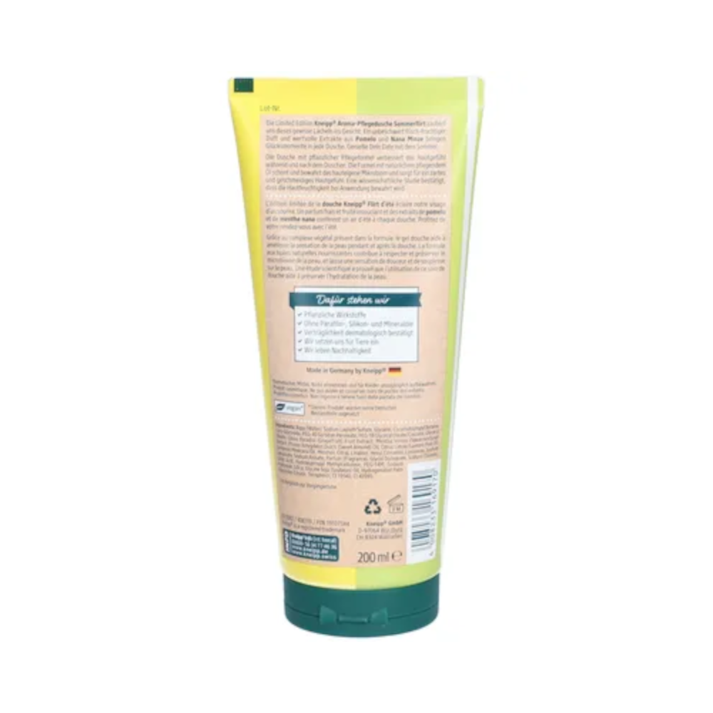 Die Limited Edition Kneipp® Aroma-Pflegedusche Sommerflirt zaubert uns dieses gewisse Lächeln ins Gesicht. Ein unbeschwert frisch-fruchtiger Duft und wertvolle Extrakte aus Pomelo und Nana Minze bringen Glücksmomente in jede Dusche. Genieße Dein Date mit dem Sommer. Die Dusche mit pflanzlicher Pflegeformel verbessert das Hautgefühl während und nach dem Duschen. Die Formel mit natürlichem pflegendem Öl schont und bewahrt das hauteigene Mikrobiom und sorgt für ein zartes und geschmeidiges Hautgefühl. Eine wissenschaftliche Studie bestätigt, dass die Hautfeuchtigkeit bei Anwendung bewahrt wird.