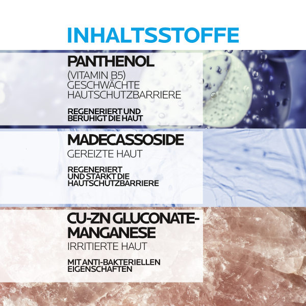 Beruhigt, schützt, regeneriert und pflegt die beanspruchte Haut bei Narben und nach ästhetischen Behandlungen. Die Bildung neuer Hautzellen wird angeregt. Wissenschaftlich bewiesene Wirksamkeit. CICAPLAST GEL B5 beschleunigt die optimale Regeneration der Hautbarriere dank einer besonderen Wirkstoffkombination: - 5% Panthenol beruhigt die Haut und wirkt mildernd bei Juckreiz, Hitzegefühl, Rötungen und Spannungsgefühl. - Thermalwasser aus La Roche-Posay für sofortige Linderung und Beruhigung der Haut. - Madecassoside stärkt die Hautschutzbarriere und unterstützt die Hautregeneration. - Kupfer/Zink/Mangan-Komplex wirkt anti-bakteriell. - Hyaluronsäure fördert und unterstützt den Wiederaufbau der Zellstruktur der Haut.