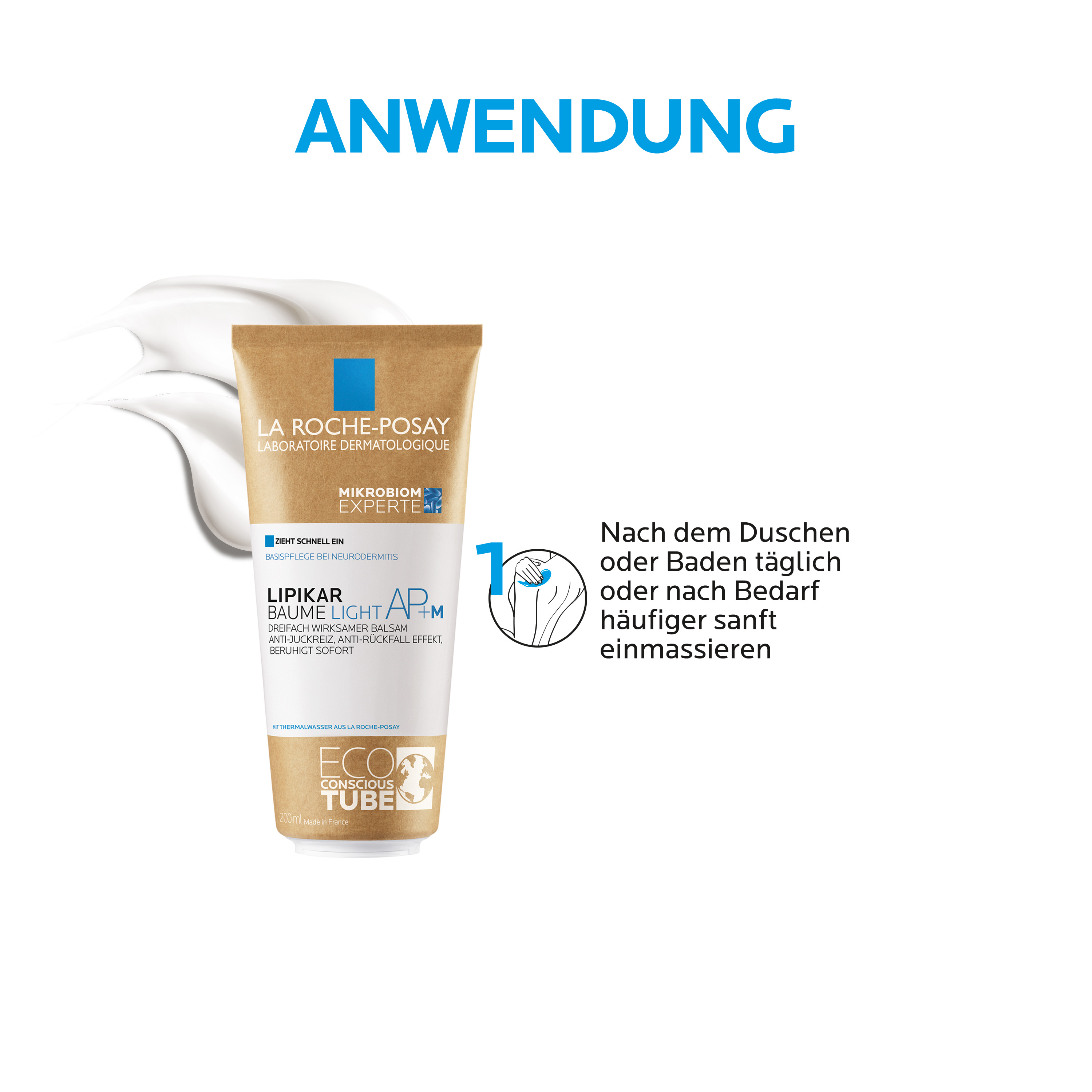Die N°1 empfohlene Dermokosmetik Marke weltweit La Roche Posay LIPIKAR Baume Light AP+M mit Anti-Juckreiz- und Anti-Rückfall-Effekt für Babys, Kinder und Erwachsene: Die Pflege für empfindliche, trockene und zu Neurodermitis neigende Haut pflegt und beruhigt zugleich. Ein schöneres Leben für empfindliche Haut ohne Juckreiz. Die Kombination 5 aktiver Wirkstoffe der Körperlotion LIPIKAR Baume Light AP+M bringt das Mikrobiom ins Gleichgewicht und stärkt die Hautschutzbarriere: