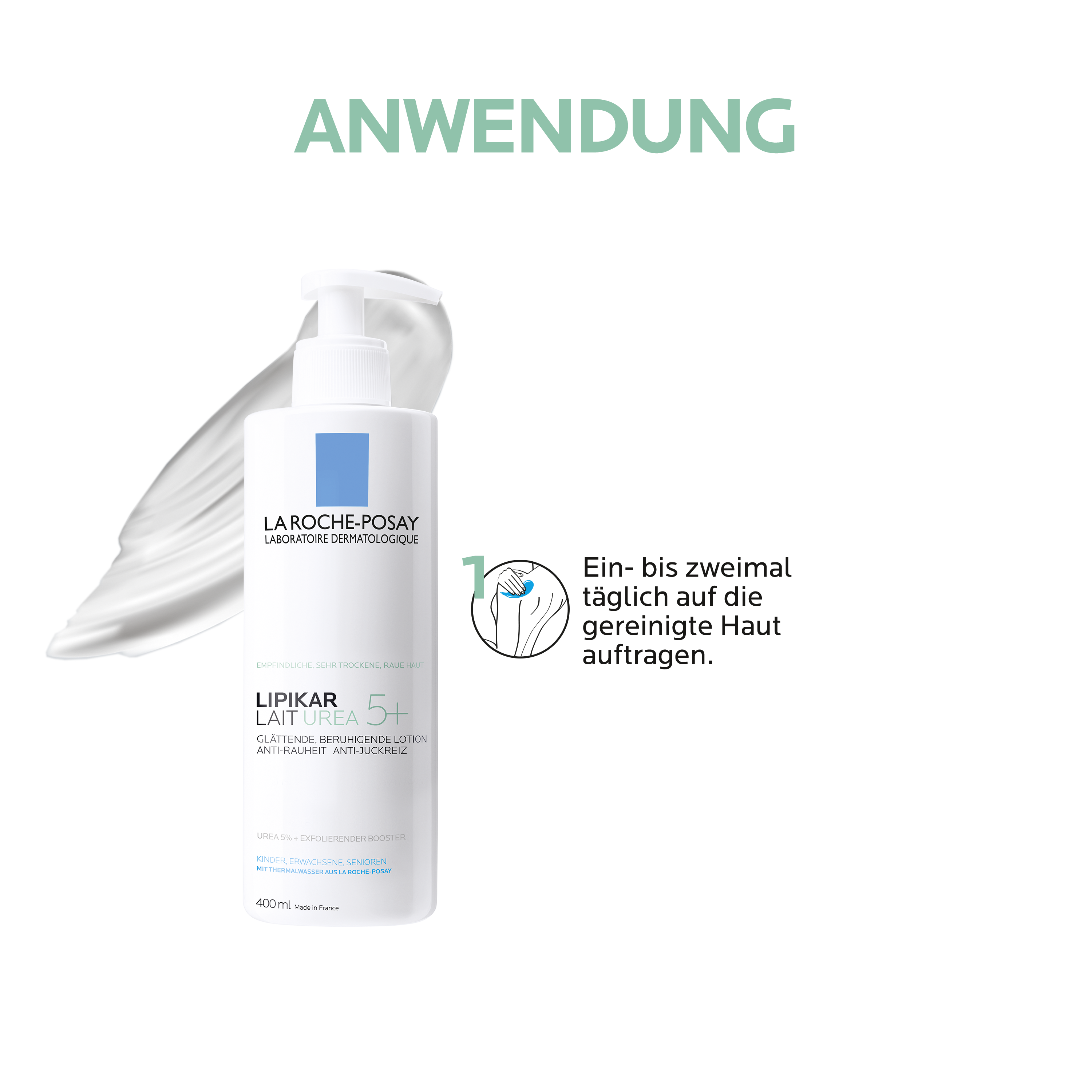 Tragen Sie die ultra-schnell einziehende LIPIKAR LAIT UREA 5+ Bodylotion ein- bis zweimal am Tag mit sanften Massagebewegungen auf den Körper auf. Idealerweise reinigen Sie zuvor Ihre Haut mit einem der Produkte aus der LIPIKAR-Serie von La Roche Posay. Diese sind aufeinander abgestimmt und verursachen keine Hautirritationen. Tipp: Der LIPIKAR STICK AP+ ist die optimale Ergänzung zu Ihrer Pflege. Der Stick hilft schnell gegen Juckreiz bei trockener und zu Neurodermitis neigender Haut.