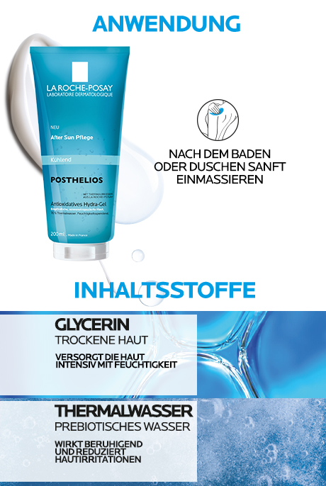 Das POSTHELIOS HYDRA GEL von La Roche-Posay ist eine erfrischende After-Sun-Pflege. Die ultraleichte Gel-Textur wirkt direkt während der Anwendung besonders kühlend und beruhigt die Haut nach dem Sonnenbad. Die vitalisierende Pflege ist mit Antioxidantien angereichert, um freie Radikale, die während einem Aufenthalt in der Sonne entstehen, zu bekämpfen und damit die Haut zu schützen. Das POSTHELIOS HYDRA GEL mit Thermalwasser aus La Roche-Posay und Glycerin, spendet der Haut bis zu 48 Stunden lang Feuchtigkeit. Dabei lindert es Rötungen und Spannungen der Haut, zieht schnell ein und hinterlässt ein angenehmes und frisches Hautgefühl. Diese After-Sun-Pflege ist ein Muss für jede Handtasche im Sommer und für die ganze Familie.