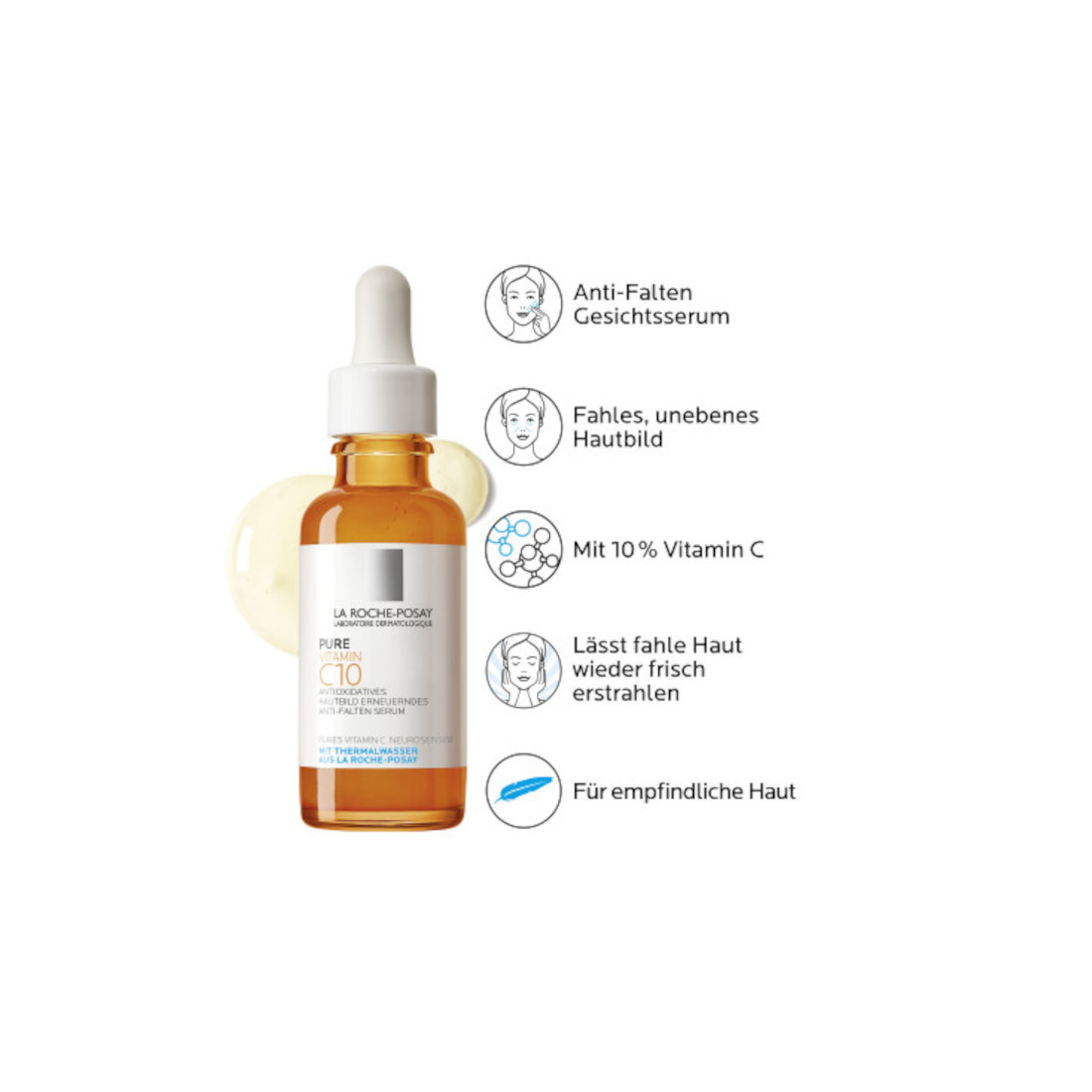 Das PURE VITAMIN C10 Serum von La Roche-Posay für eine weichere, frischere und strahlendere Haut. Die Kombination aus Vitamin C, Salicylsäure und Neurosensine mildert Hautalterungszeichen wie Fältchen und Pigmentflecken. Das Resultat: Die Haut wirkt sichtbar glatter und schöner. Durch pures Vitamin C gewinnt die Haut an Strahlkraft und erhält ihren natürlichen Glow zurück. Dank Salicylsäure werden abgestorbene Hautschüppchen entfernt, sodass das Hautbild ebenmäßiger und verfeinert wird. Der Aktivstoff Neurosensine wirkt zusätzlich entzündungshemmend und beruhigend auf die Haut. Aufgrund seiner innovativen Formulierung mit einem hautneutralem pH-Wert ist PURE VITAMIN C10 für alle Hauttypen, insbesondere für empfindliche Haut, geeignet. Das optimale Anti-Aging-Serum mit Vitamin C für eine jünger wirkende, strahlendere Haut!